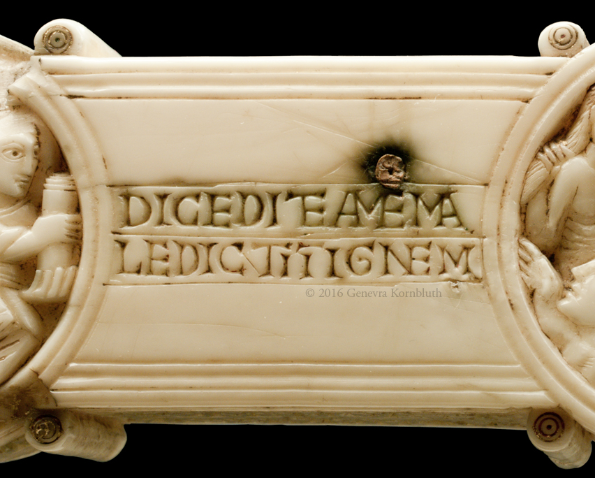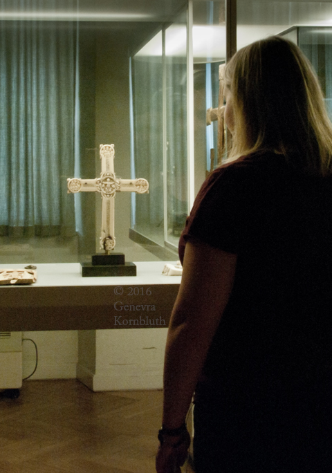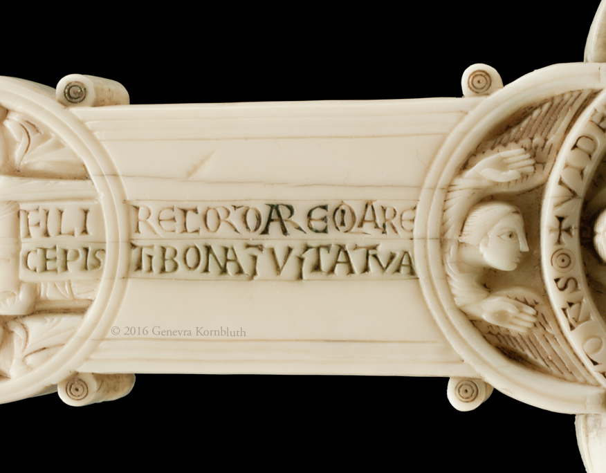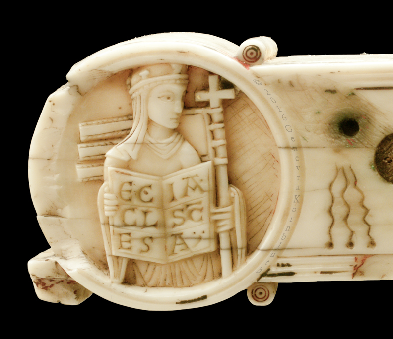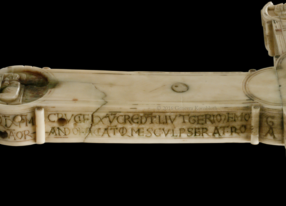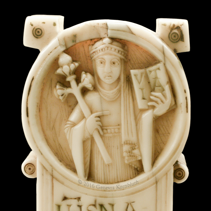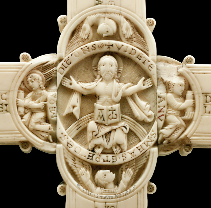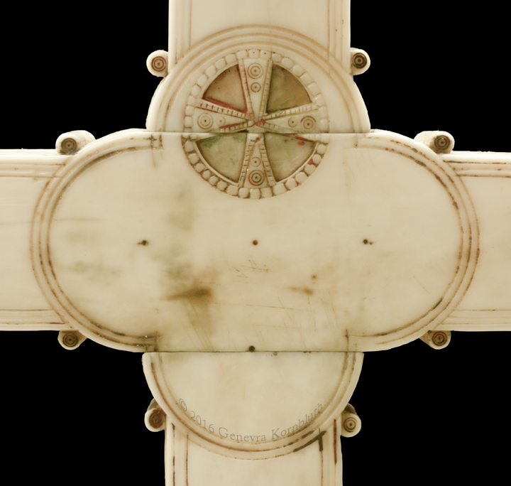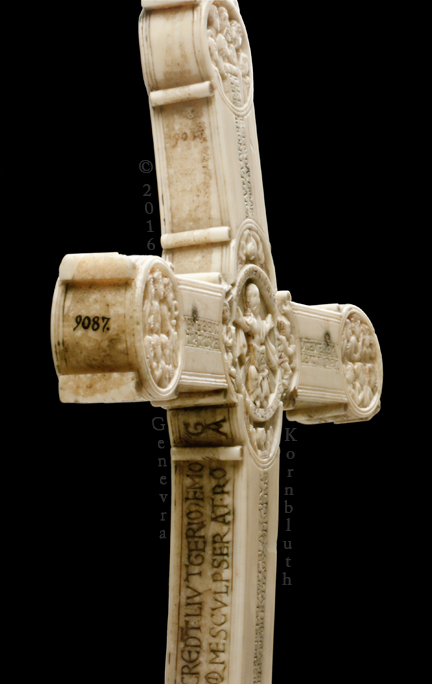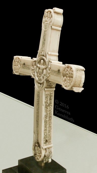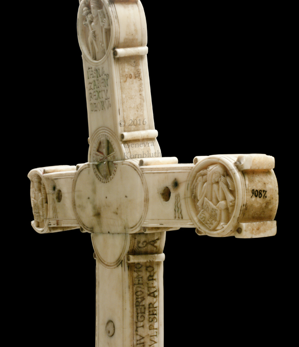 Historical Archive: Gunhild Cross made for Gunhild, probably daughter of King Sweyn III Grathe (d. 1157) around 1150 or 1170-1175 walrus ivory with traces of pigment, 28.5 x 22 x 2.5 cm (11.22 x 8.67 x .98 inch) Latin inscription on narrow sides: "Who sees me, let him pray to Christ for Helena, daughter of King Sweyn Magnus, she who had me made in memory of the Lord's passion. Those who believe in Christ crucified pray in memory of Liutger who carved me at the request of Helena, who is also called Gunhild." Copenhagen, National Museum of Denmark 9087 |