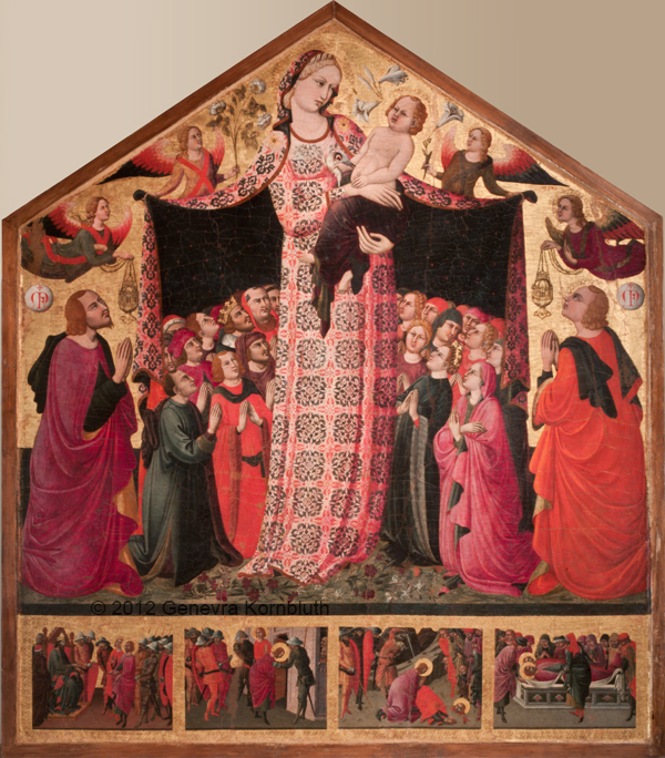 Parri Spinelli, Madonna of Mercy w. lives SS. Lorentino, Pergentino, tempera/panel 1435-37, Arezzo MS, which has its own page