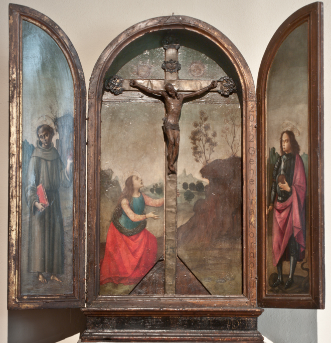 Crucifixion w. SS. Mary Magdalen, Anthony of Padua, George; attrib. Bartolomeo di Giovanni, late 15th c., Arezzo MS, which has its own page