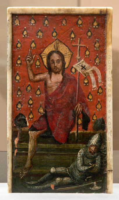 Resurrection, painted ivory, early 15th c., poss. Cologne, Schn B167. For reverse see Schn.