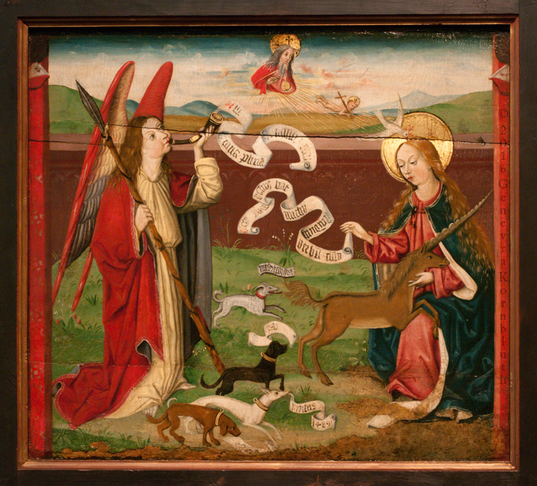 Annunciation/mystic hunt for the unicorn, circle of Martin Schongauer 1489, Pushkin 2734