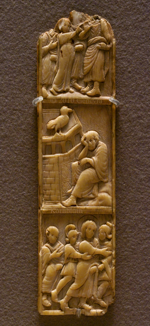 Annunciation, Ordeal, Flight; ivory, 6th c. eastern Mediterranean (Syria?), Louvre OA 11149. Part of same object as Hermitage Visitation/Annunciation to Anna.