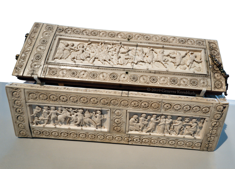 Veroli Casket, ivory and bone, mid to late 10th c., V&A 216-1865. This work has its own page.