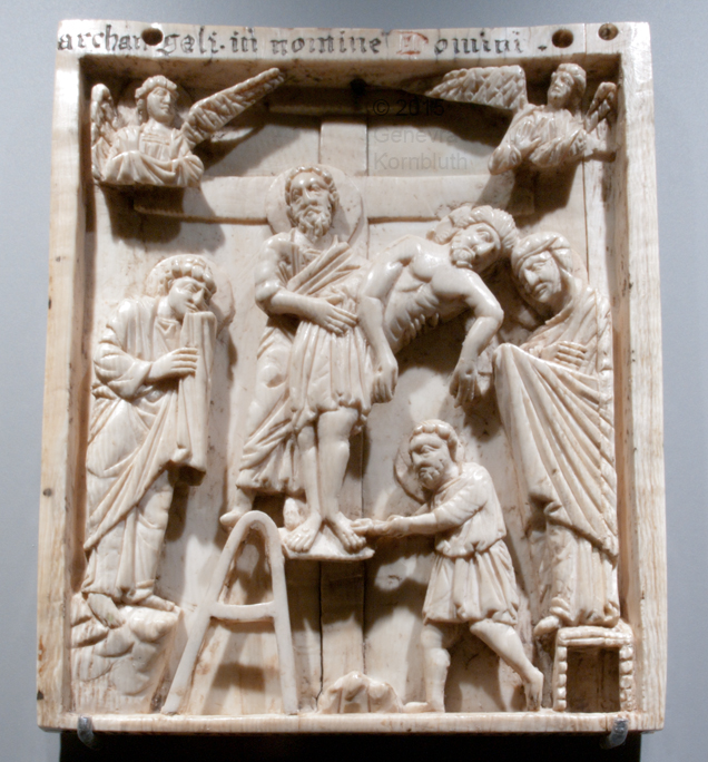 deposition, ivory, 12th c. north Italy, inscription prob. 14th c., HildMus DS11. For other views see HildMus.