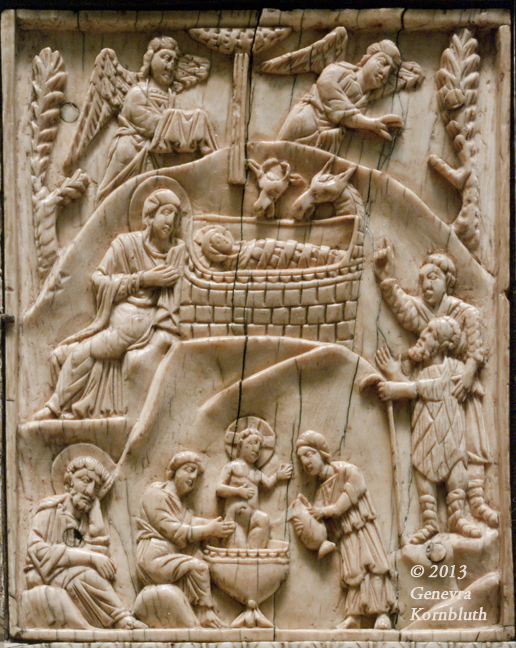 Nativity ivory, Venice?, 12th/13th c.; on reliquary icon: frame silver gilt on wood, Constantinople 11th/12th c.; conversion to reliquary with horn 14th/15th-c. Germany. Louvre OA 11399. This work has its own page.