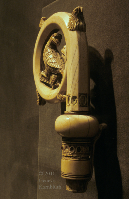 ivory crozier head, St. Nicholas birth, refusal to nurse; c.1150-70, V&A 218-1865. For other views see V&A.