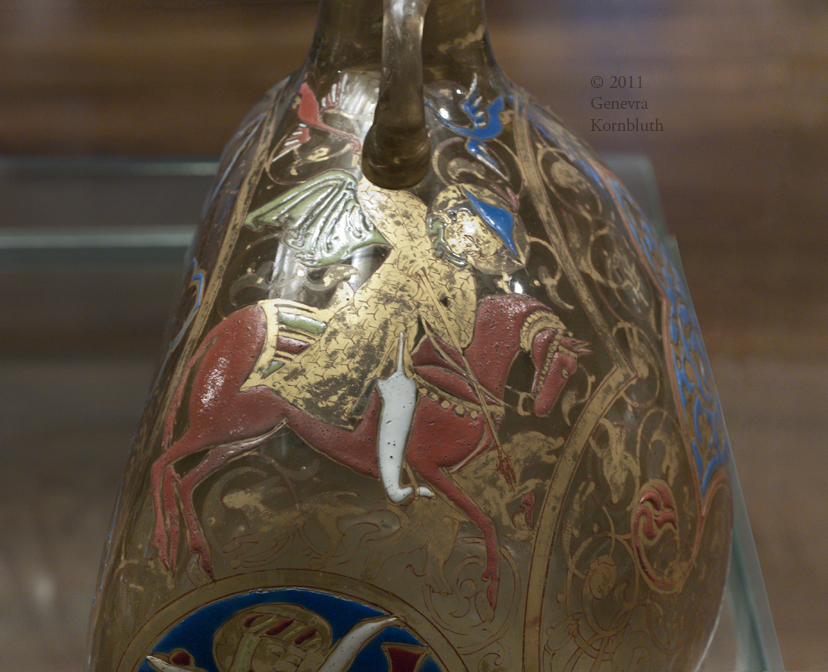 glass water bottle in the shape of pilgrim's flask, Syria c.1250-60, BM 1869,0120.3. This work has its own page with another horse.