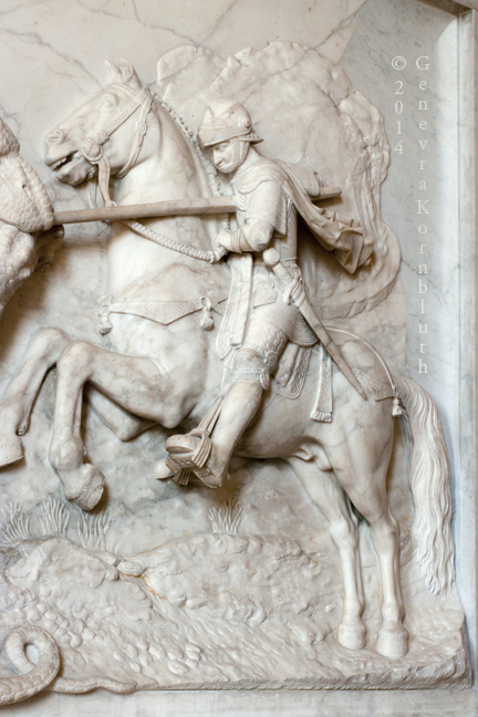 St. George and the dragon, marble, Michel Colombe 1509-10; frame prob. Jerome Pacherot, Jean Chersalle, Bertrand de Meynal. Louvre MR 1645. This work has its own page.