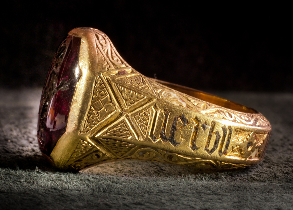 Historical Archive: John the Baptist Ring garnet intaglio in gold ring with niello and enamel stone 1.47 x 1.1 cm, ring 2.85 x 2.43 cm (.58 x .43, 1.12 x .96 inches) Italy, fourteenth century Latin inscription: Verbum caro factu(m est), The word was made flesh Vienna, Kunsthistorisches Museum XII 168