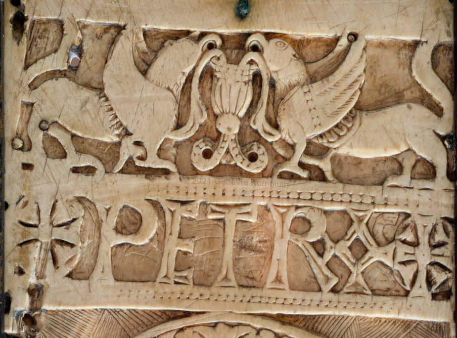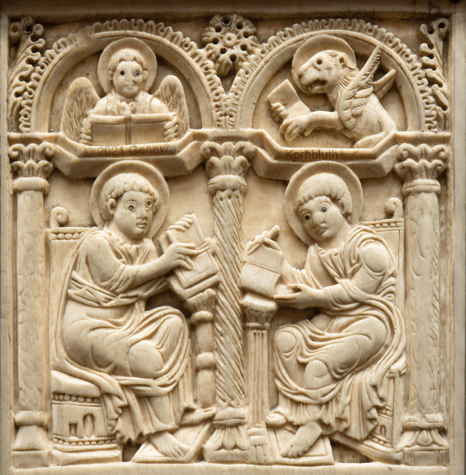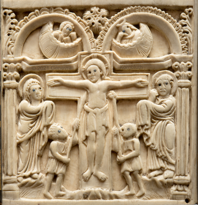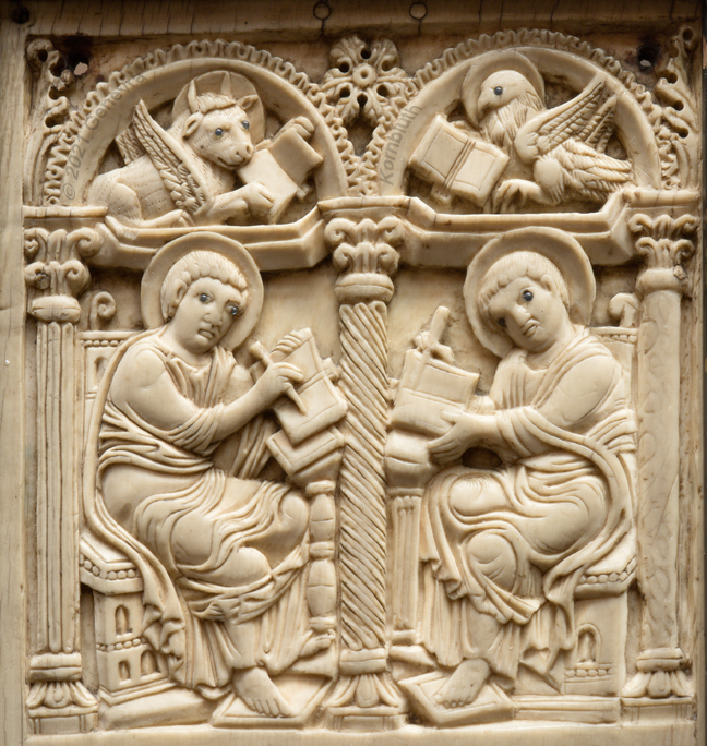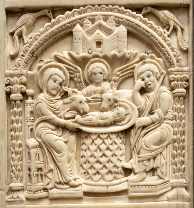 Historical Archive: Harrach diptych back probably Spain or northern Italy, 7th-8th century front "Court School of Charlemagne", Aachen, early ninth century ivory with glass eyes, full object 33.7 x 23 cm (13.3 x 9 inches) wooden frame postmedieval, left and right panels switched formerly in the collection of Count Harrach, Hrádek Castle, Bohemia loan from the Ludwig collection, Aachen Cologne, Schnütgen Museum 1012