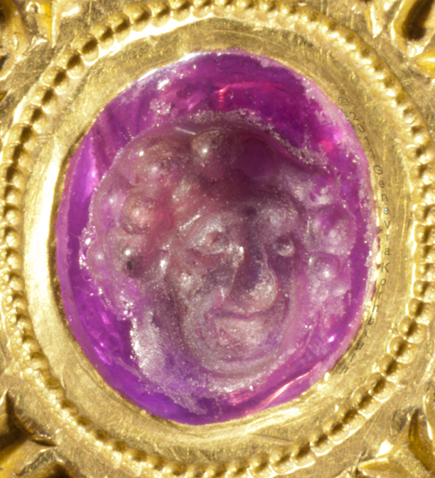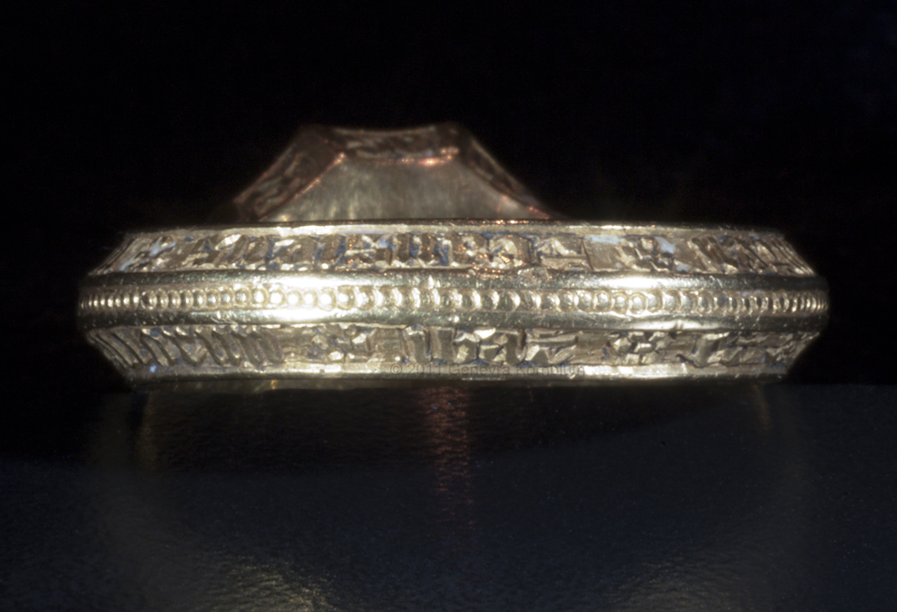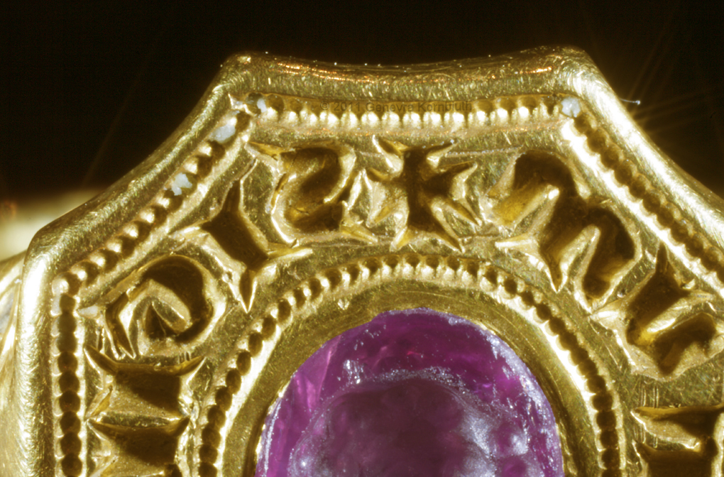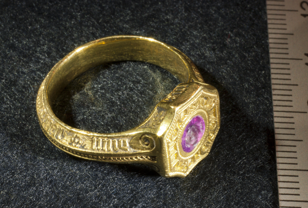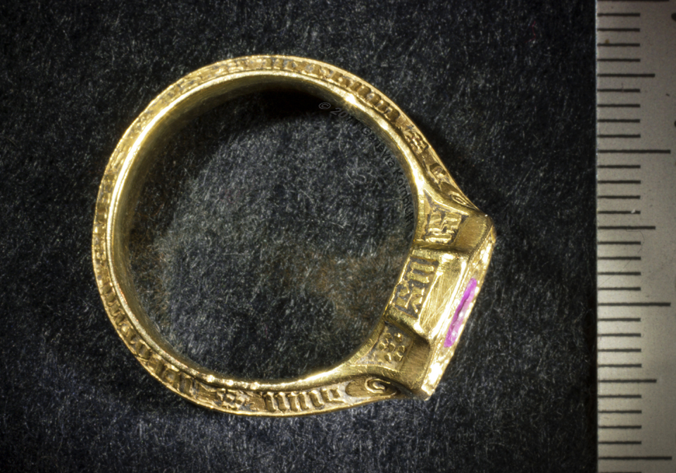 Signet ring "of the Black Prince" possibly owned by Prince Edward of Woodstock, 1330-1376 ruby or garnet intaglio, gold, and traces of enamel ring diameters 2.3 and 2.7 cm (0.9 x 1.1 inch) second half of fourteenth century bezel inscription: SIGILLUM SECRETUM, "secret seal" inscription on edge of bezel: S/ GE/OR/GI/US, "Saint George" inscription on sides of band: +IEXUS AVTEM * TRANSIENS * PER * ME DIVM ILLORVM * IBAT * ET * VERBUM * C "But he passing through the midst of them. And the Word" (Luke 4, John 1) Paris, Musée du Louvre OA 9597 |