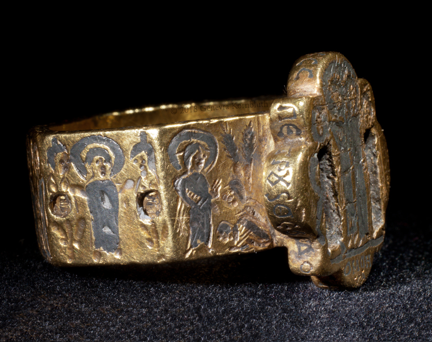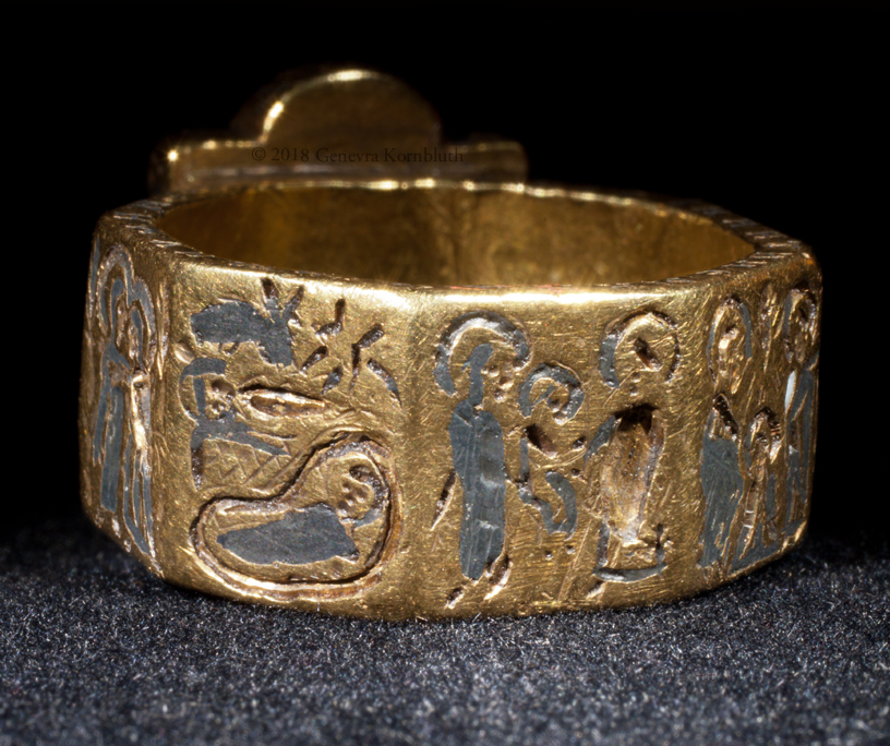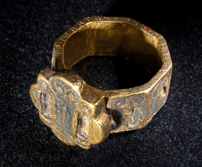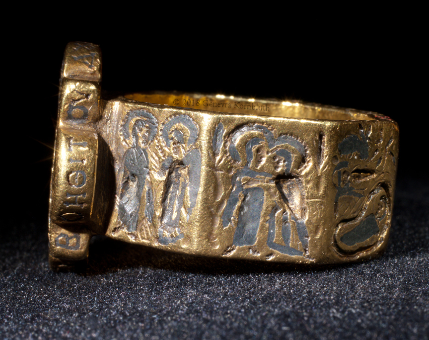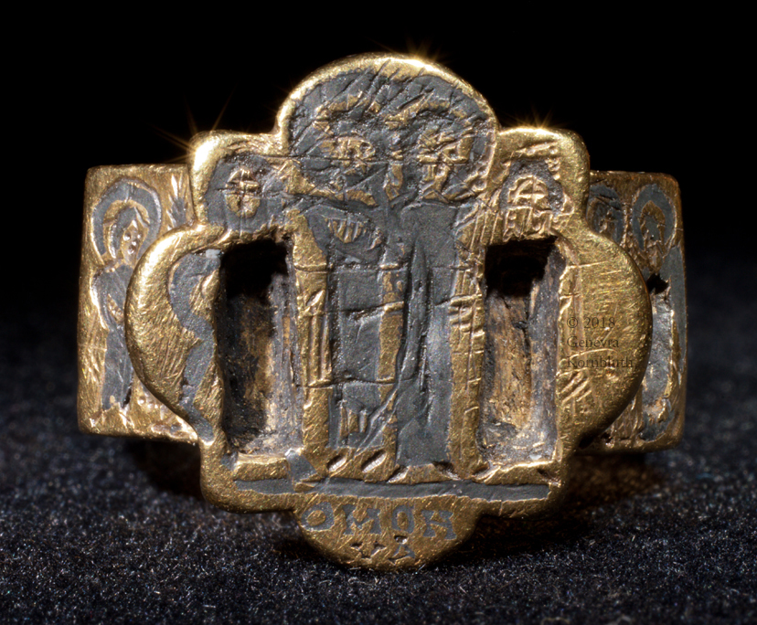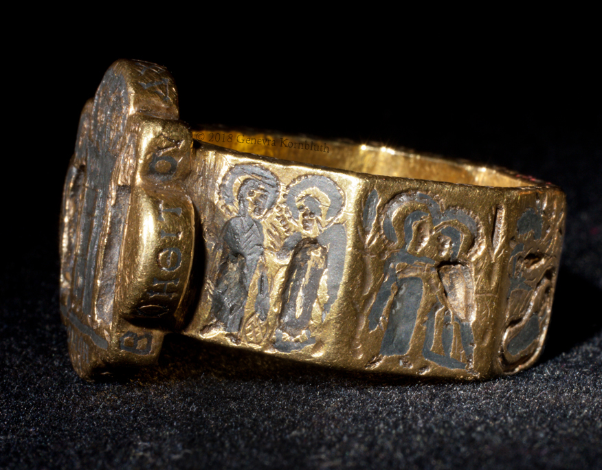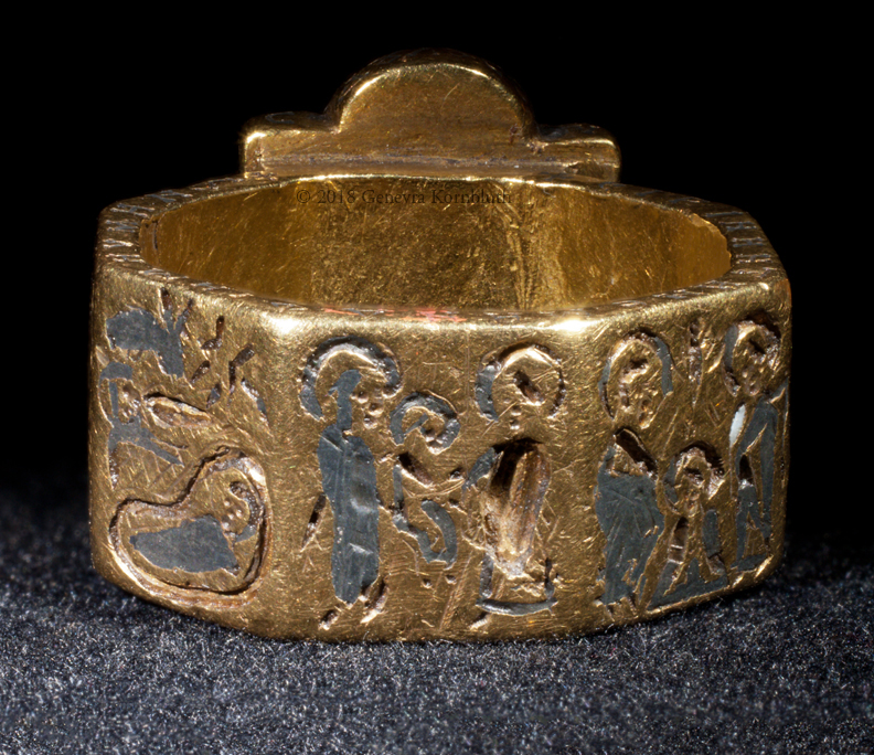 Historical Archive: Marriage Ring gold and niello 2.3 x 3.2 x 3.2 cm (7/8 x 1 1/4 x 1 1/4 inches) Byzantine, seventh century inscriptions in Greek around bezel: Lord, help thy servants, Peter and Theodote on band: My peace I leave with you; My peace I give unto you Dumbarton Oaks, Washington D.C., BZ.1947.15 |
