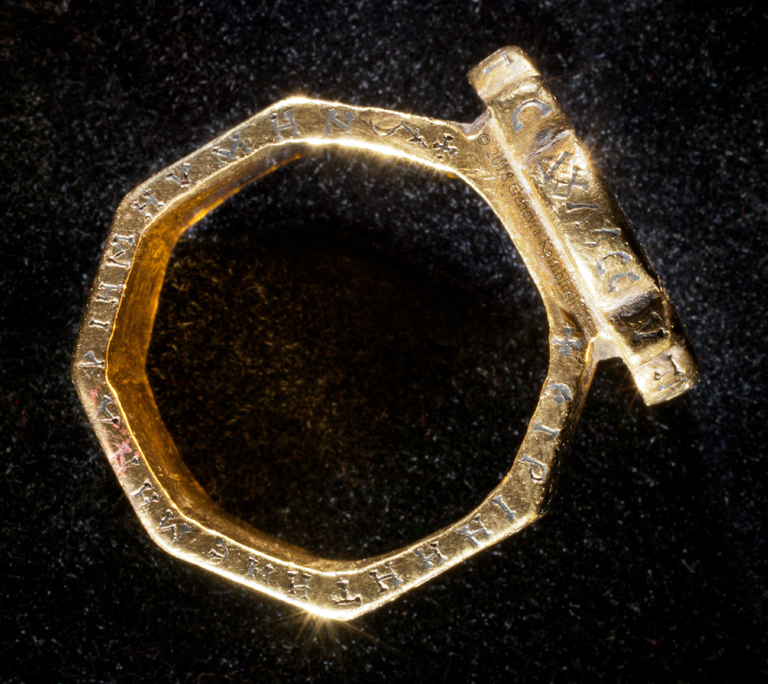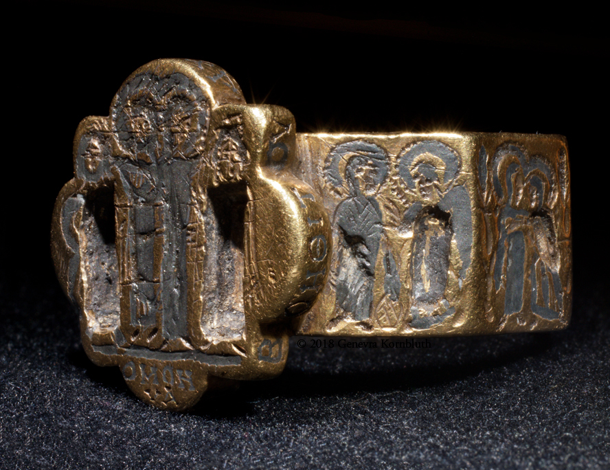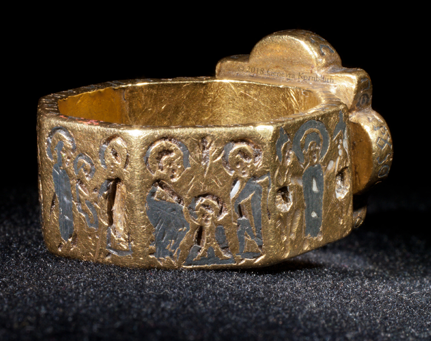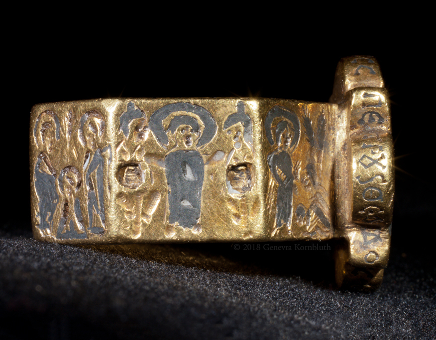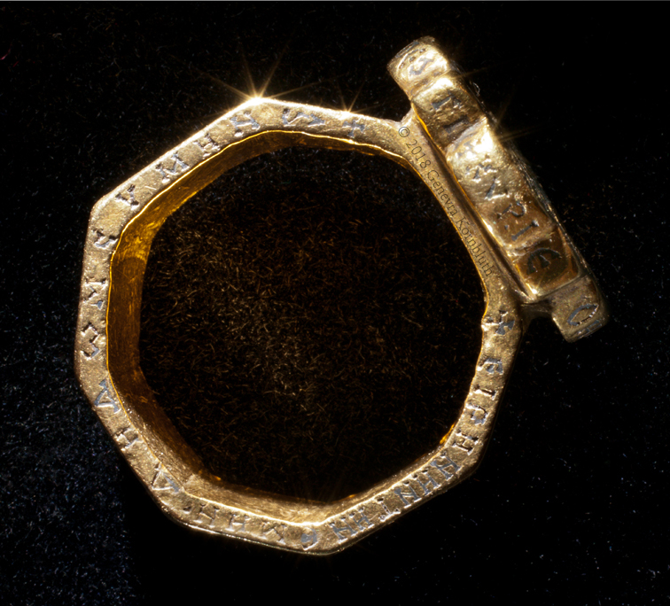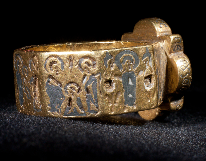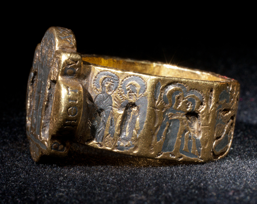 Historical Archive: Marriage Ring gold and niello 2.3 x 3.2 x 3.2 cm (7/8 x 1 1/4 x 1 1/4 inches) Byzantine, seventh century inscriptions in Greek around bezel: Lord, help thy servants, Peter and Theodote on band: My peace I leave with you; My peace I give unto you Dumbarton Oaks, Washington D.C., BZ.1947.15 |
