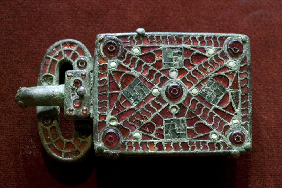 buckle from Visigothic Spain, bronze with garnets, green glass, and mother-of-pearl, c.535-60, CMA 2001.119