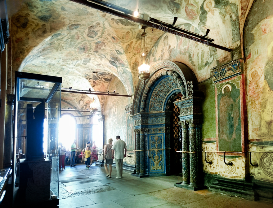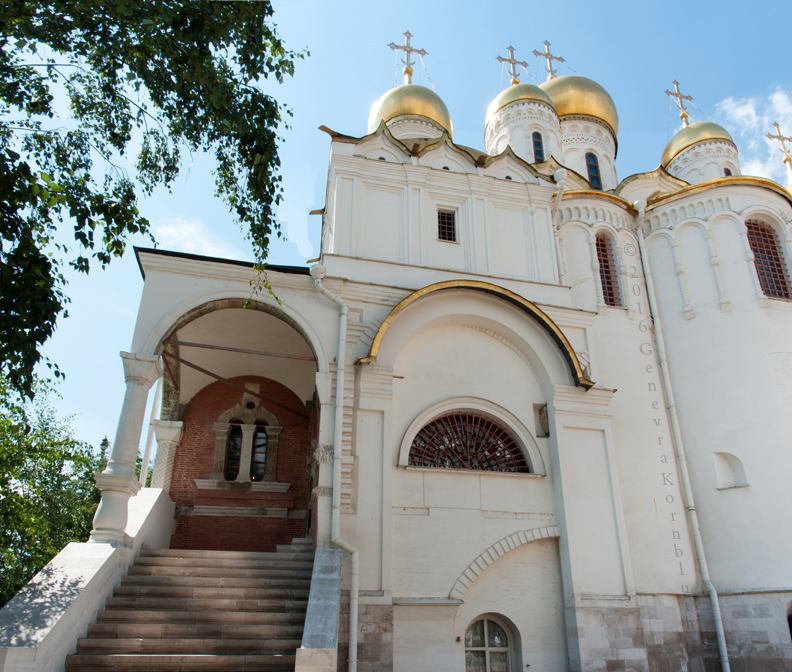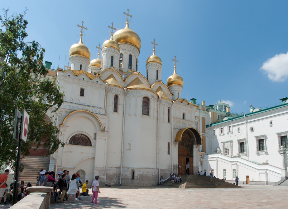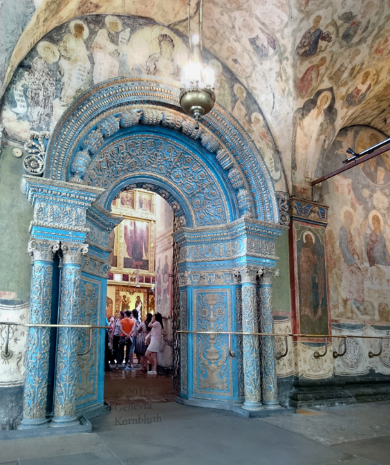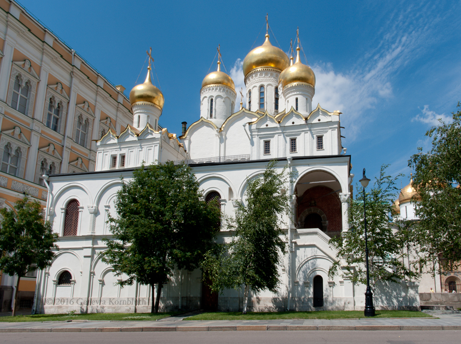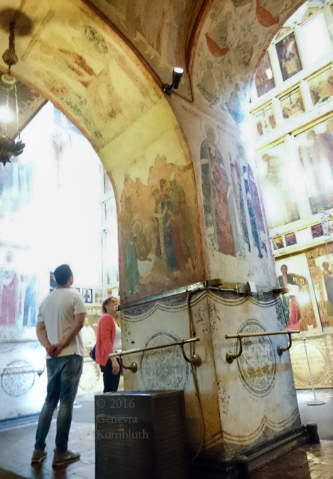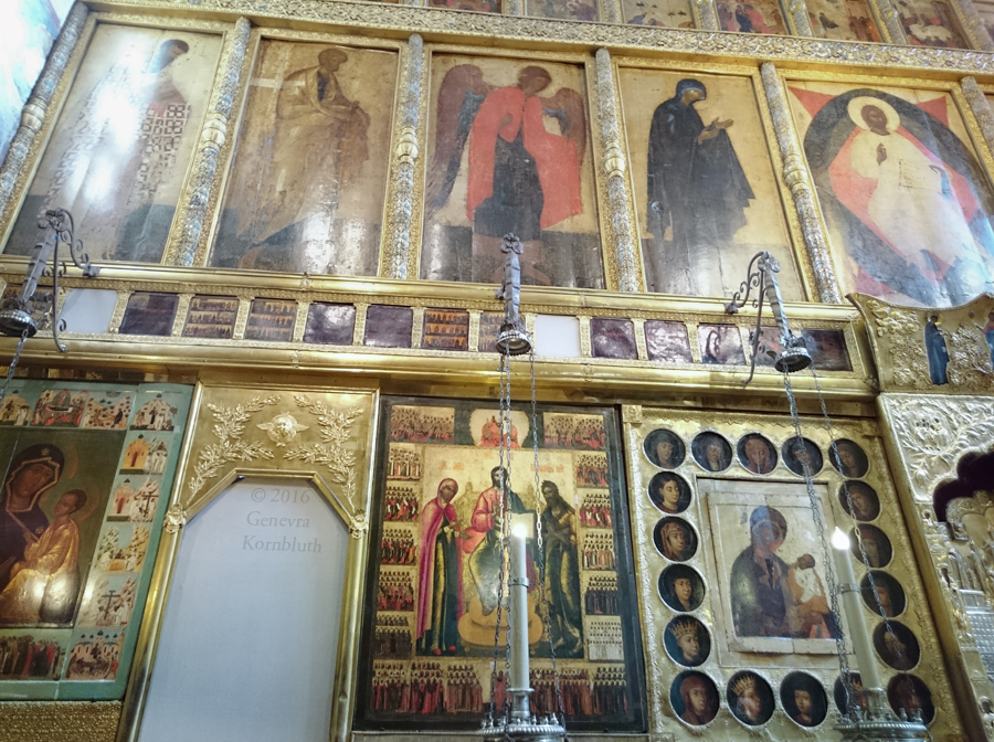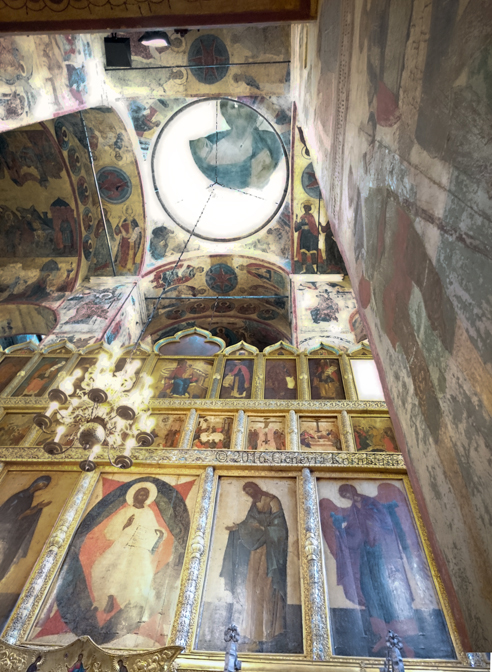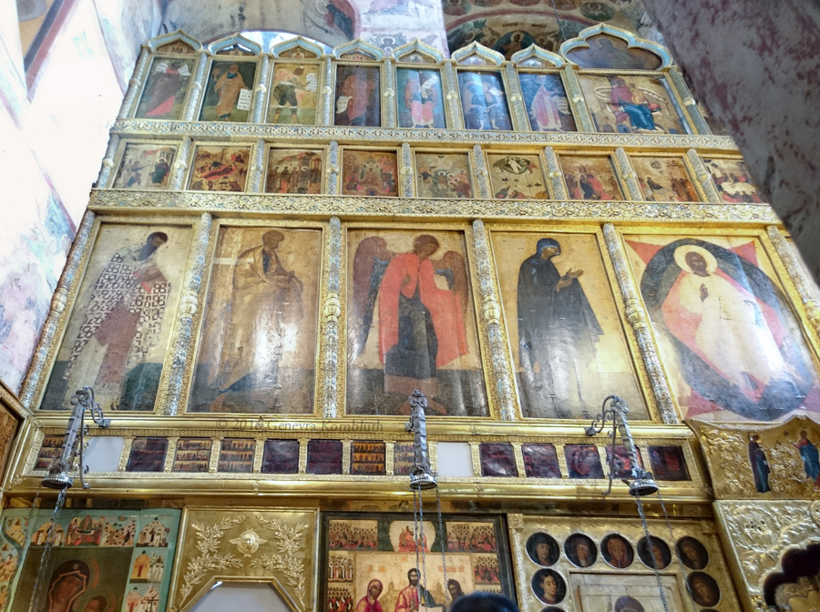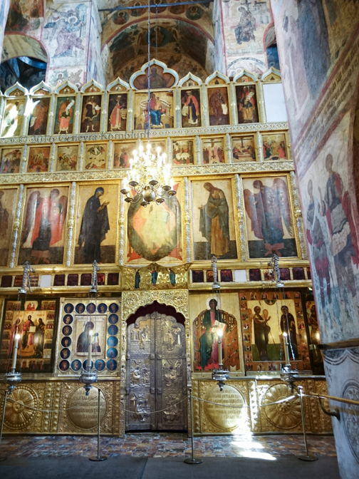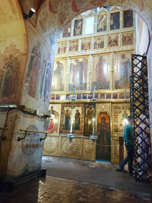 Historical Archive: Cathedral of the Annunciation, Blagoveschensky sobor Kremlin, Moscow foundations reused from 1416 church built 1484-1489 by master masons Kryvtsov and Myshkin of Pskov 1547 fire; restoration 1564-66 as palace cathedral for Ivan IV (the Terrible), with added domes and upper corner chapels Wall paintings 1547-1551 when not otherwise noted 1737 fire; restored 1815-20; closed from 1918, museum from 1955, renewed religious usage after 1992; restored 2006-10 Iconostasis 14th-19th century, restored 1920s Base roundels, center: prayers to Mary and Christ; sides: patronage Alexander III and Nicholas II Holy Doors, silver gilt, 1818 (Annunciation, Evangelists); columns, canopy, crown 1838 First painted tier (lowest, Veneration), left to right: Our Lady of Tikhvin, c.1565-1600; Deesis, late 17th c.; Virgin and Child, 15th c.; Christ enthroned, 1337, overpaint 16/17th c.; Annunciation, 1600-50; SS Peter, John the Baptist, and Alexis, 1682 Fyodor Zubov and others Second tier up (Menaion, calendar cycle): 17th c. Third tier (Deesis), left to right: Basil the Great, Peter; Michael, Mary, Christ Pantokrator, John the Baptist, and Gabriel prob. by Theophanes the Greek, late 14th c. Fourth tier (Feasts) early 15th c., Nativity and other panels poss. Andrei Rublev (Rublyov); Crucifixion poss. Prokhor Gorodets Fifth tier (Prophets), highest rectangular panels: mid 16th c. Sixth tier (Patriarchs, Forefathers): 1770s. framework gilded brass and enamel on copper, 1894 design N.V. Sultanov, completed 1896 by I.P. Khlebnikov jewelry firm