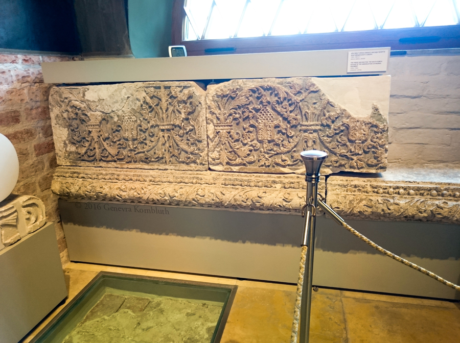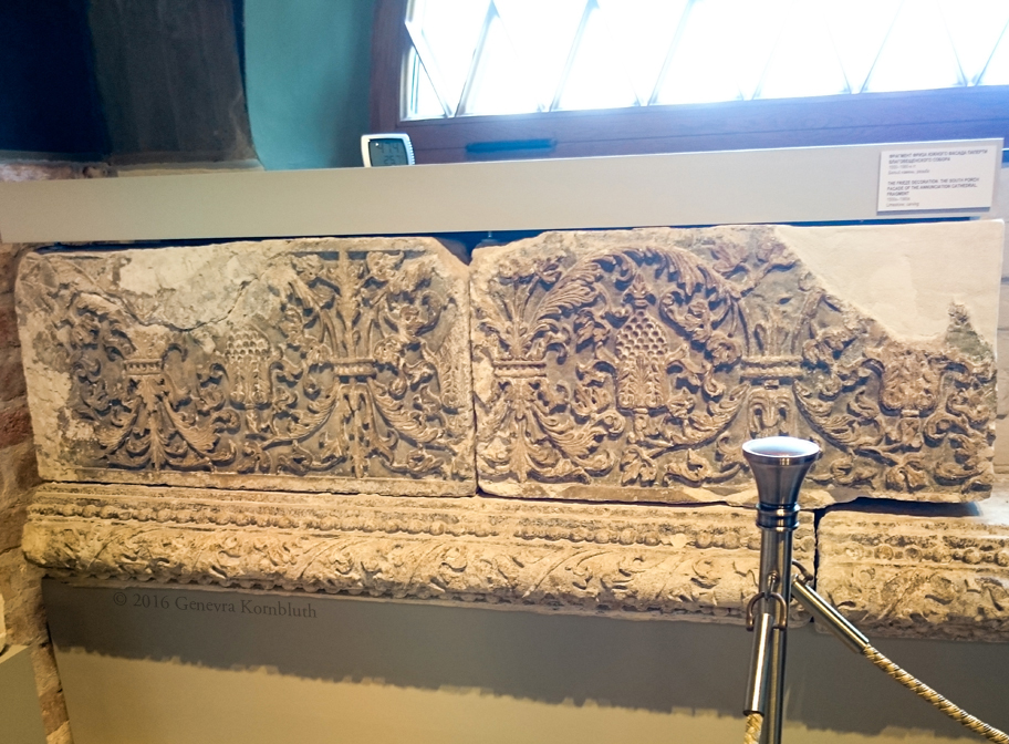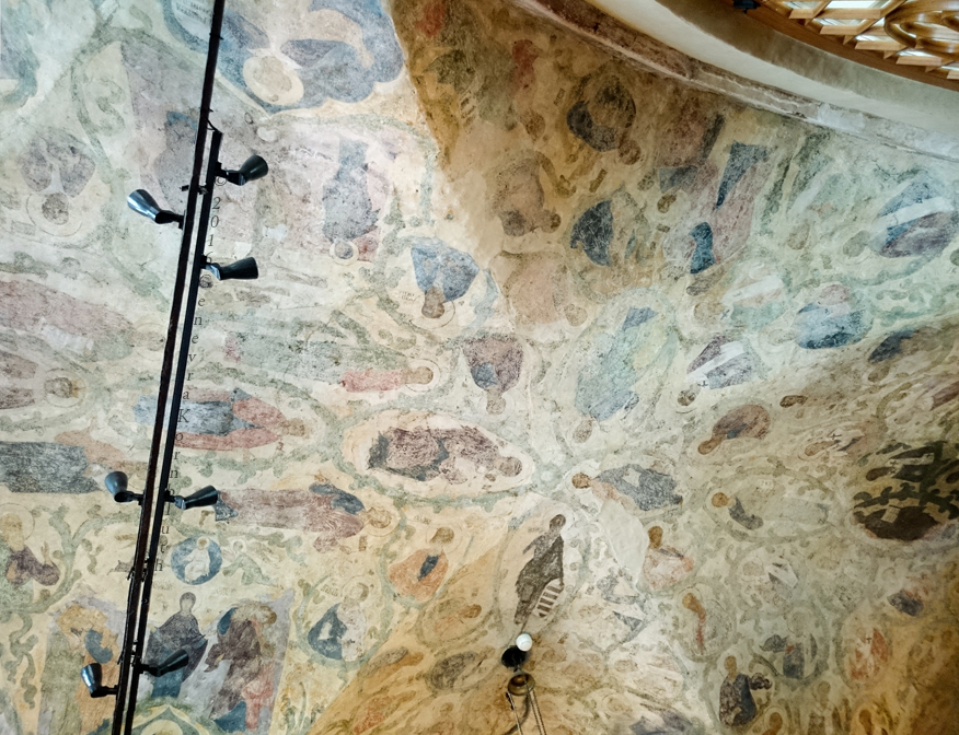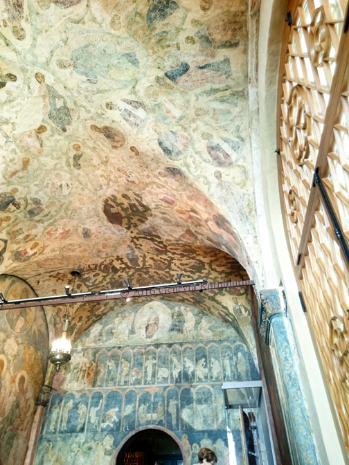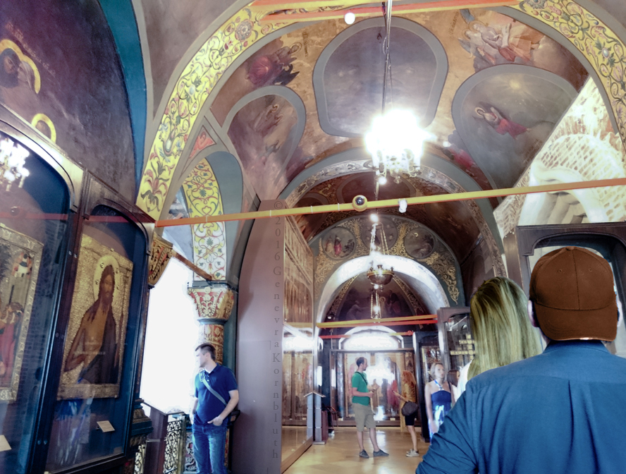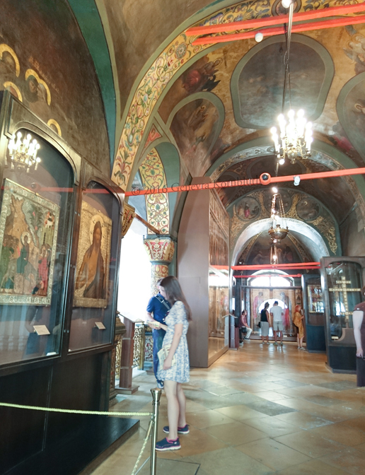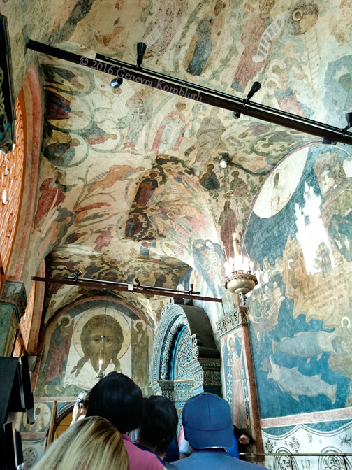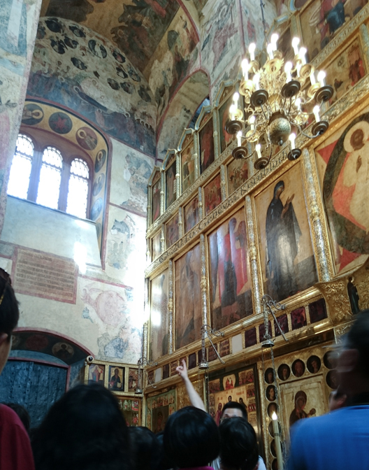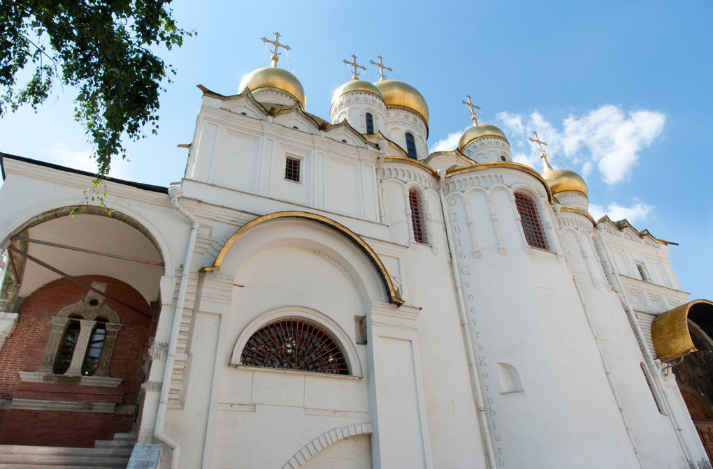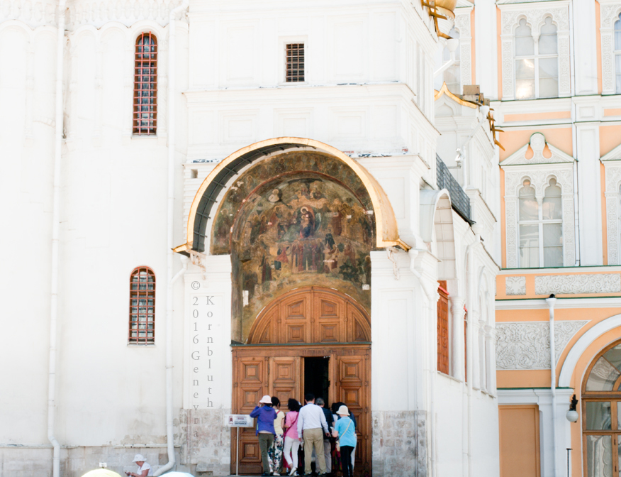 Historical Archive: Cathedral of the Annunciation, Blagoveschensky sobor Kremlin, Moscow foundations reused from 1416 church built 1484-1489 by master masons Kryvtsov and Myshkin of Pskov 1547 fire; restoration 1564-66 as palace cathedral for Ivan IV (the Terrible), with added domes and upper corner chapels Wall paintings 1547-1551 when not otherwise noted 1737 fire; restored 1815-20; closed from 1918, museum from 1955, renewed religious usage after 1992; restored 2006-10 Iconostasis 14th-19th century, restored 1920s Base roundels, center: prayers to Mary and Christ; sides: patronage Alexander III and Nicholas II Holy Doors, silver gilt, 1818 (Annunciation, Evangelists); columns, canopy, crown 1838 First painted tier (lowest, Veneration), left to right: Our Lady of Tikhvin, c.1565-1600; Deesis, late 17th c.; Virgin and Child, 15th c.; Christ enthroned, 1337, overpaint 16/17th c.; Annunciation, 1600-50; SS Peter, John the Baptist, and Alexis, 1682 Fyodor Zubov and others Second tier up (Menaion, calendar cycle): 17th c. Third tier (Deesis), left to right: Basil the Great, Peter; Michael, Mary, Christ Pantokrator, John the Baptist, and Gabriel prob. by Theophanes the Greek, late 14th c. Fourth tier (Feasts) early 15th c., Nativity and other panels poss. Andrei Rublev (Rublyov); Crucifixion poss. Prokhor Gorodets Fifth tier (Prophets), highest rectangular panels: mid 16th c. Sixth tier (Patriarchs, Forefathers): 1770s. framework gilded brass and enamel on copper, 1894 design N.V. Sultanov, completed 1896 by I.P. Khlebnikov jewelry firm