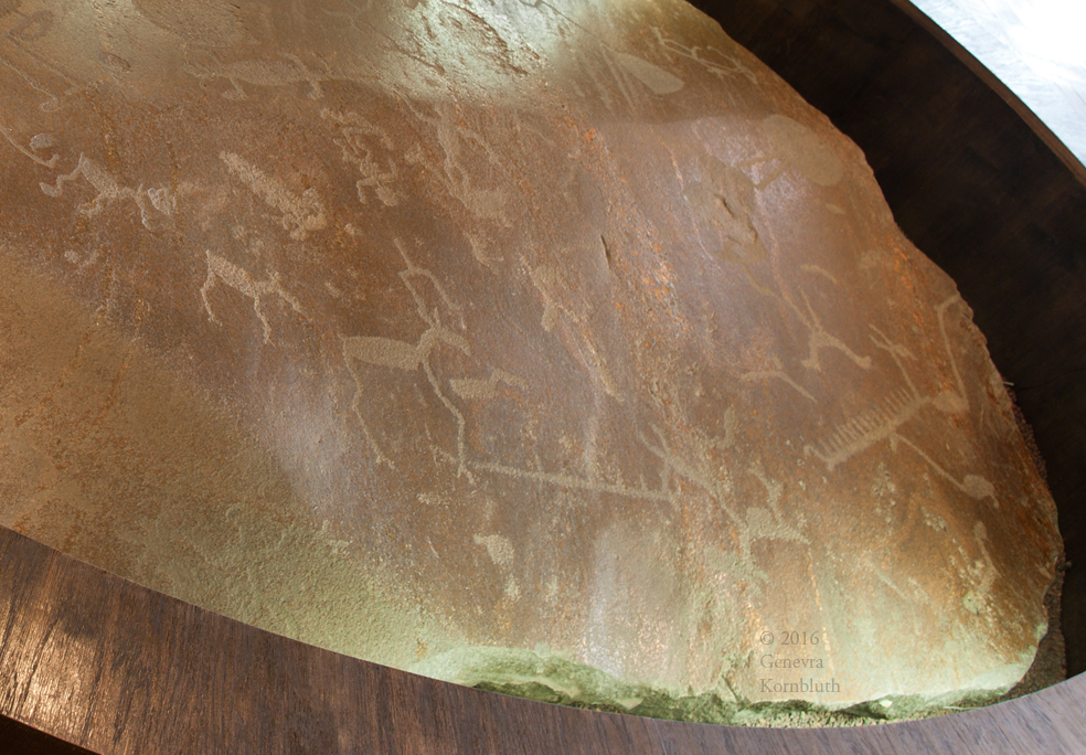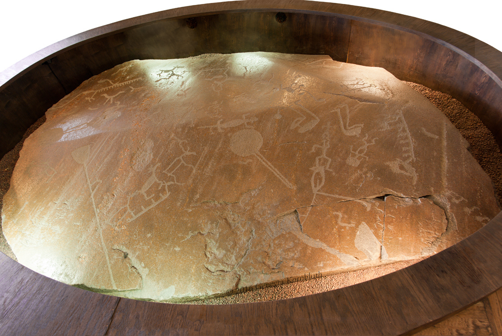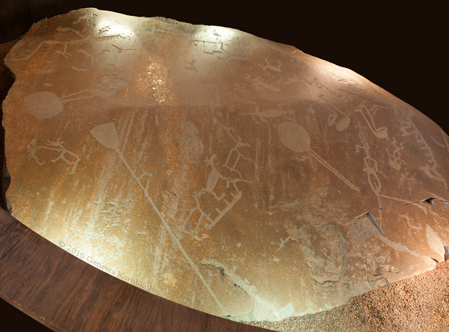 Historical Archive: Petroglyphs from the headland of Besov Nos, eastern shore of Lake Onega, Karelia granite, third to second millennium BCE humans, deer, elk, birds, boats with people, hunting scenes Saint Petersburg, State Hermitage Museum