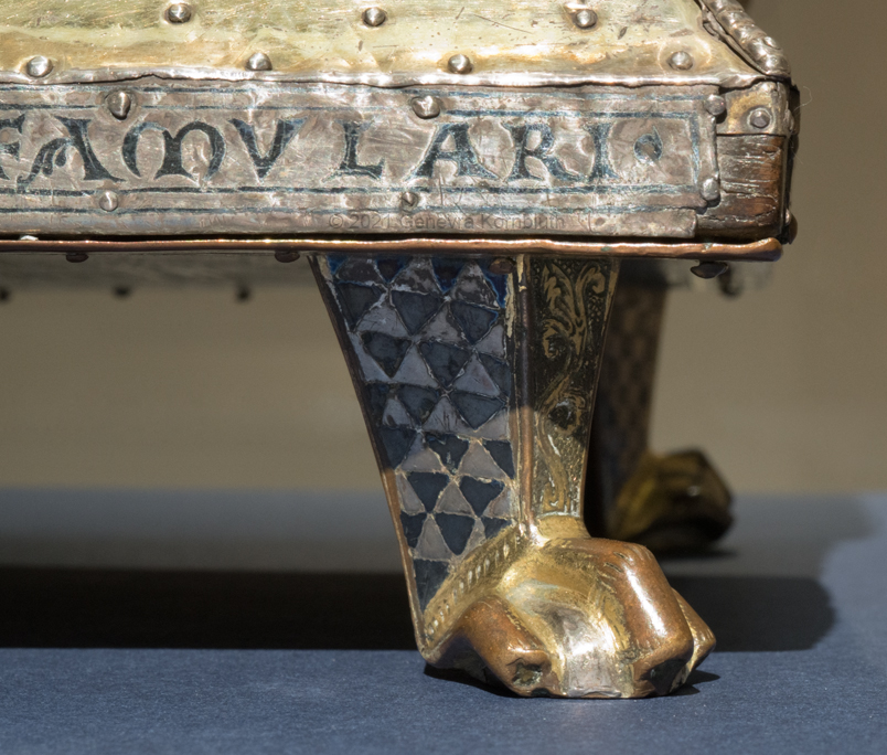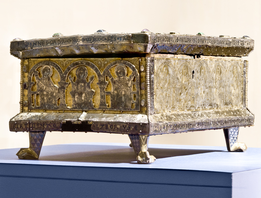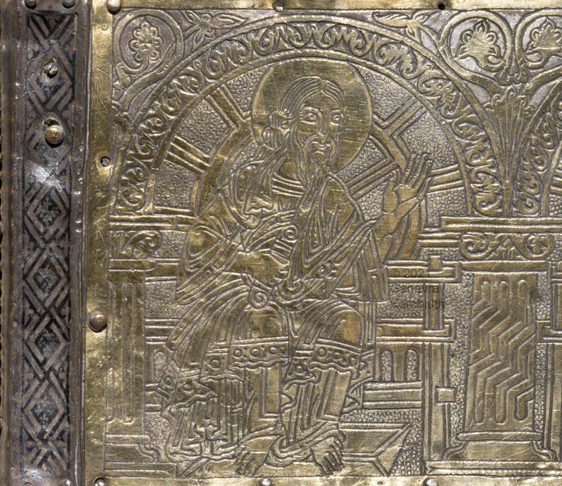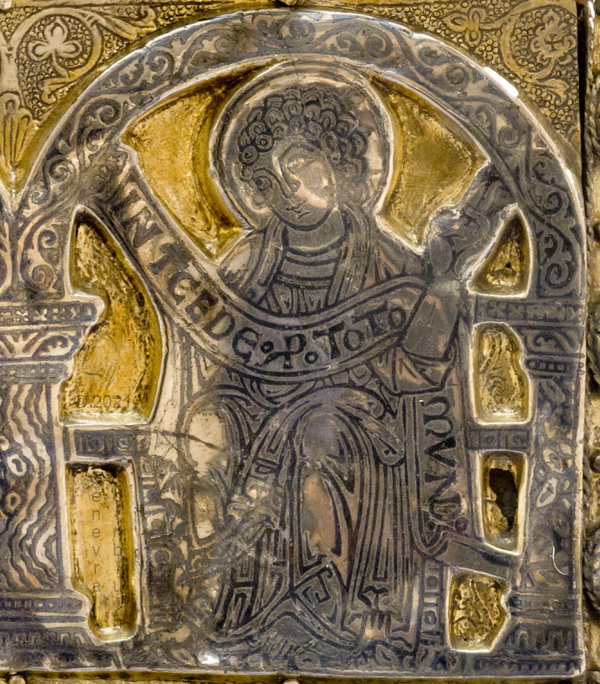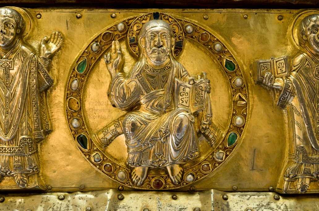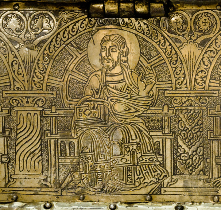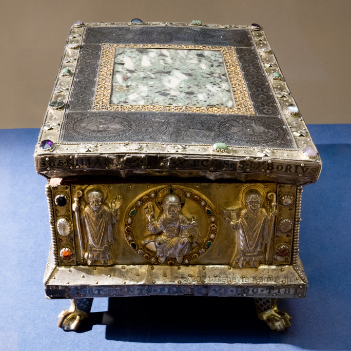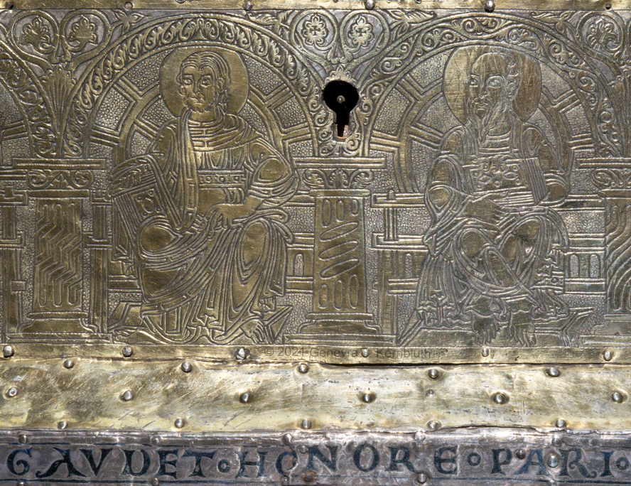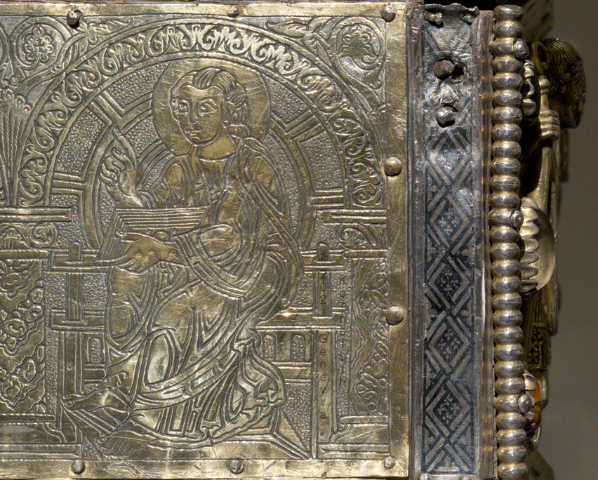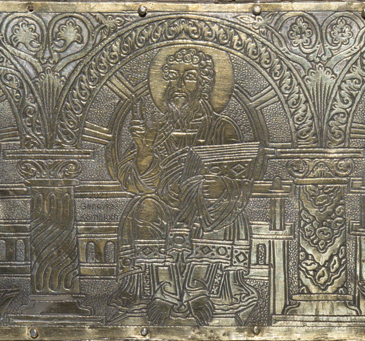 Historical Archive: Portable Altar from Paderborn Cathedral Roger of Helmarshausen, around 1105 or 1120-1127 made for Paderborn Bishop Henry II of Werl (reg. 1084 or 1090-1127) silver, gold, copper, bronze, gems oak core, altar stone green marble (Verde antico) 34.5 x 21.2 x 16 cm (13.6 x 8.3 x 6.3 inches) gems on top and corner strips later medieval lock and hinges 1650-61; walls of wooden core restored Paderborn Diocesan Museum DS2 |