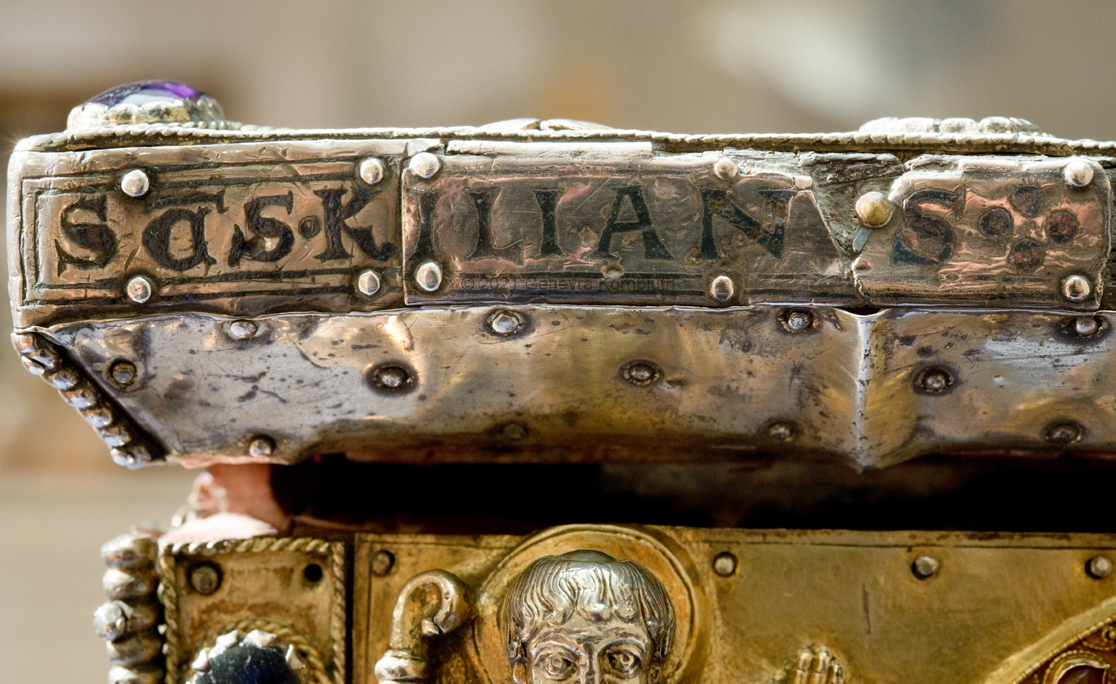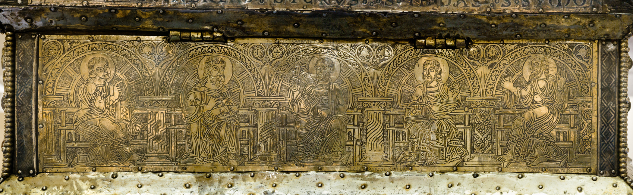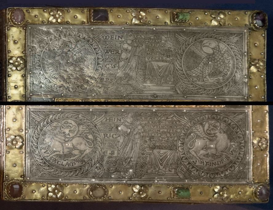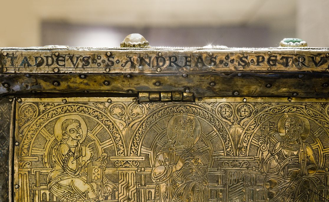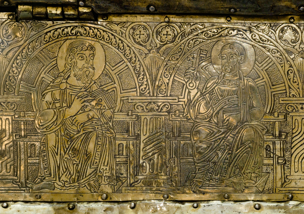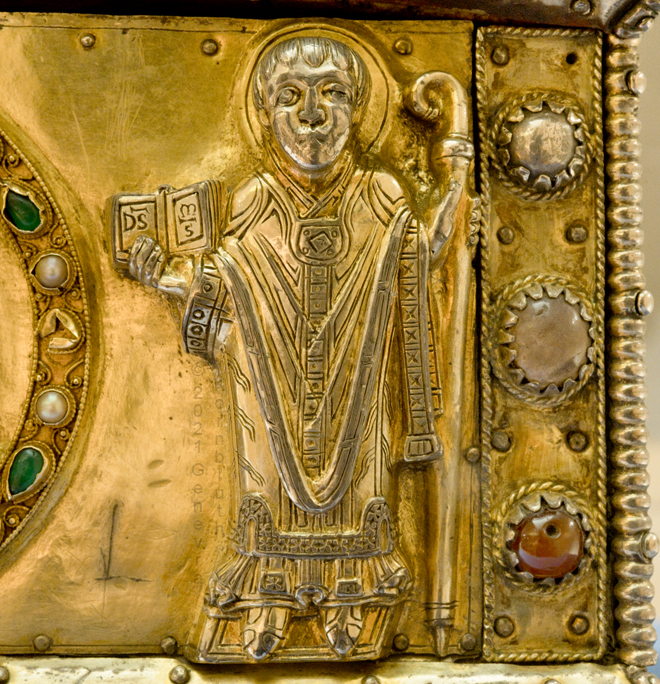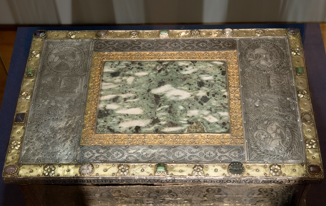Historical Archive: Portable Altar from Paderborn Cathedral Roger of Helmarshausen, around 1105 or 1120-1127 made for Paderborn Bishop Henry II of Werl (reg. 1084 or 1090-1127) silver, gold, copper, bronze, gems oak core, altar stone green marble (Verde antico) 34.5 x 21.2 x 16 cm (13.6 x 8.3 x 6.3 inches) gems on top and corner strips later medieval lock and hinges 1650-61; walls of wooden core restored Paderborn Diocesan Museum DS2 |