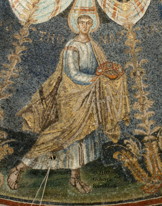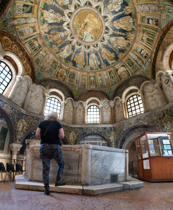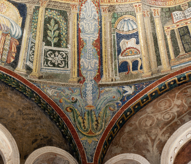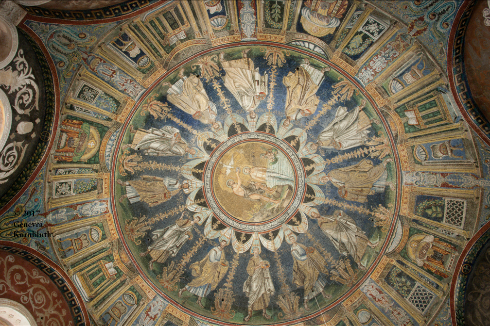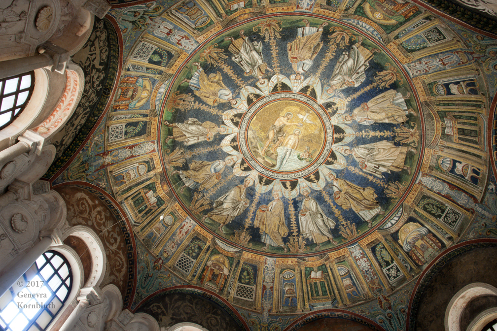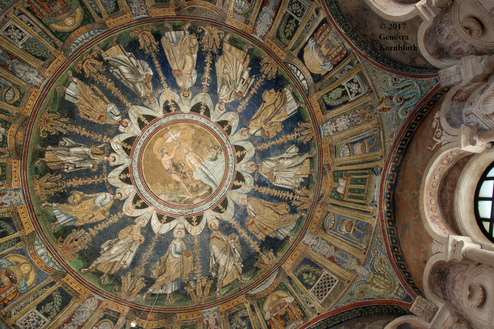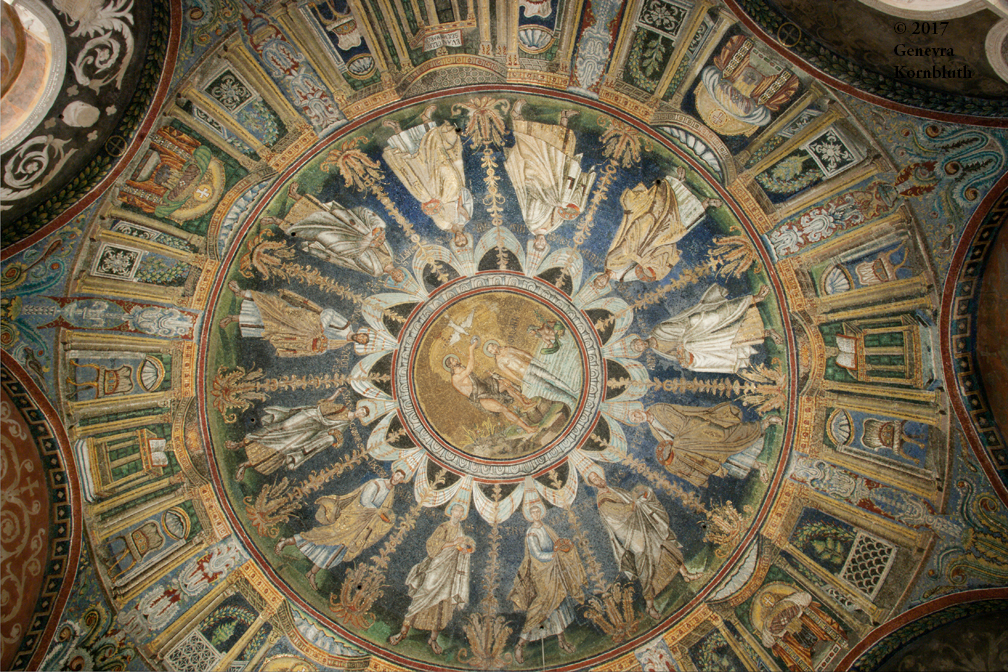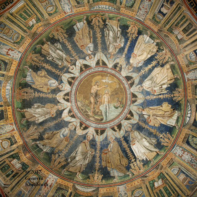 Baptism heavily restored, 18th c. and in 1860s Felice Kibel: heads, dove, upper cross, gold ground around them