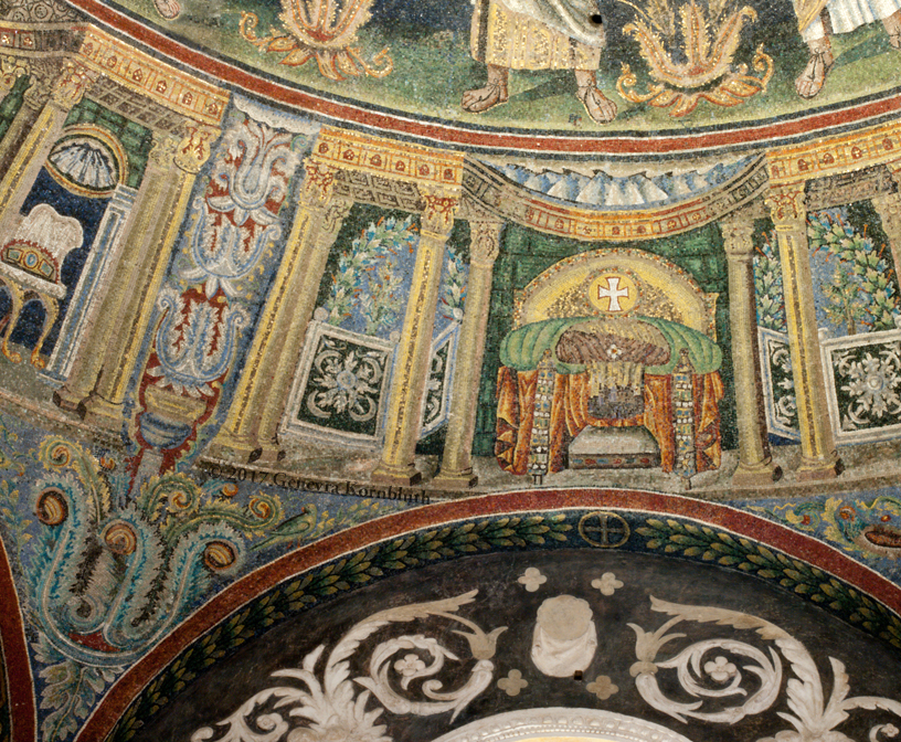 prepared throne (Etimasia) below Bartholemew, with ?floral candelabrum and painted tympanum