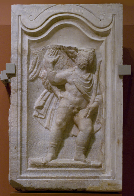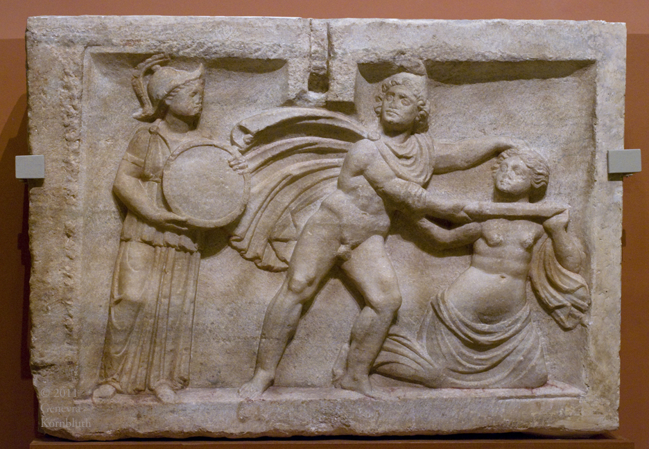 mythological sarcophagus, end: Perseus killing Medusa, marble, Pécs-Aranyhegy (Hungary) mid 2nd c., HNM 62.84.1