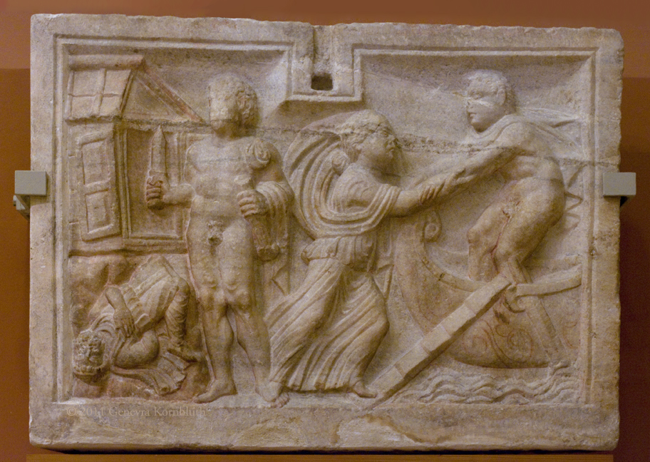 mythological sarcophagus, end: Iphigenia's escape from Tarsus, marble, Pécs-Aranyhegy (Hungary) mid 2nd c., HNM 62.84.2