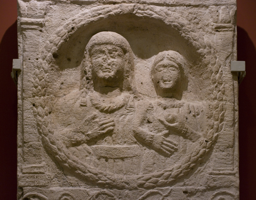 grave stone of Brogimara and her daughter Iantuna wearing torcs, Buda (Hungary) early 2nd c., HNM 31.18471