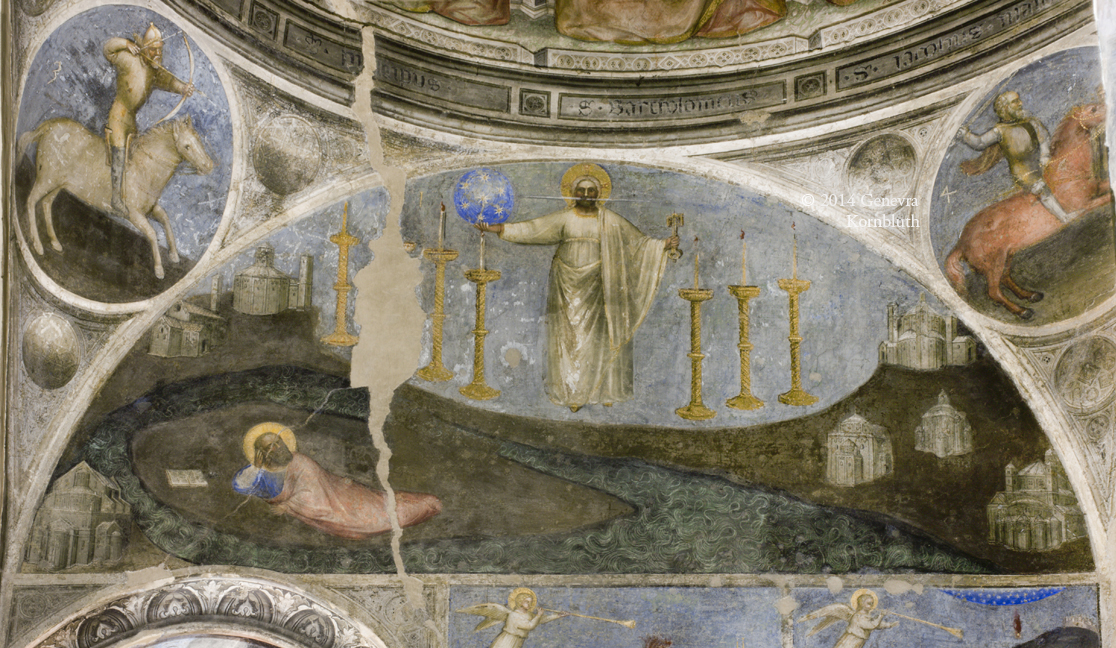 John the Evangelist having vision of Revelation: Baptistery, cathedral of Padua, 1376 paintings: Giusto de' Menabuoi. This work has its own pages.