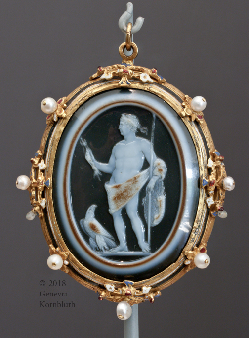 frame, Italy, late 16th c.: gold, pearls, enamel; for agate cameo Emperor Claudius as Jupiter, agate cameo 41-54 CE. AIC 1991.375. For profile see AIC.