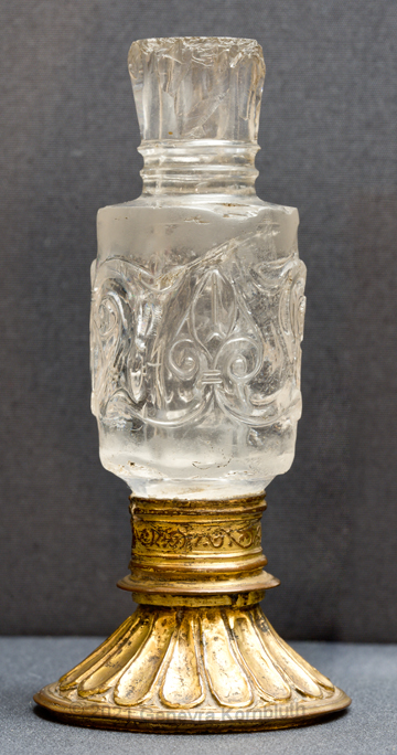 gilt copper base Italy 16th c., mounted rock crystal vial, palmette side: prob. Abbasid 9th-early 10th c.; Schn G19. For another view see Schn.