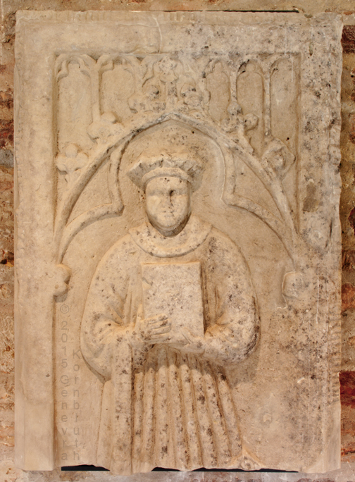 Canon Bruno von Alten, sandstone/black material in inscription, 1518, HildMus G21