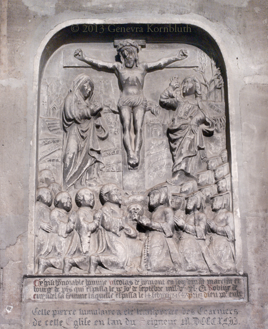 grave marker of Nicolas de Bonont and his wife and 15 children with Crucifixion, 1547, St. Séverin, Paris, which has its own page.