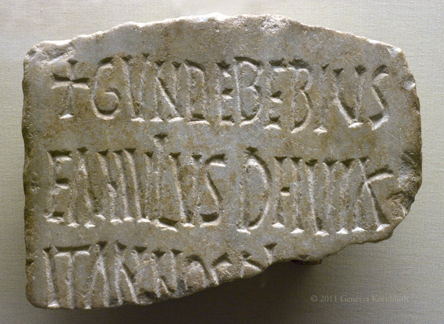 grave marker of Gundebebius, marble, 6th-7th c., from Visigothic Santiponce (Spain), BM OA.9295. For detail see BM.