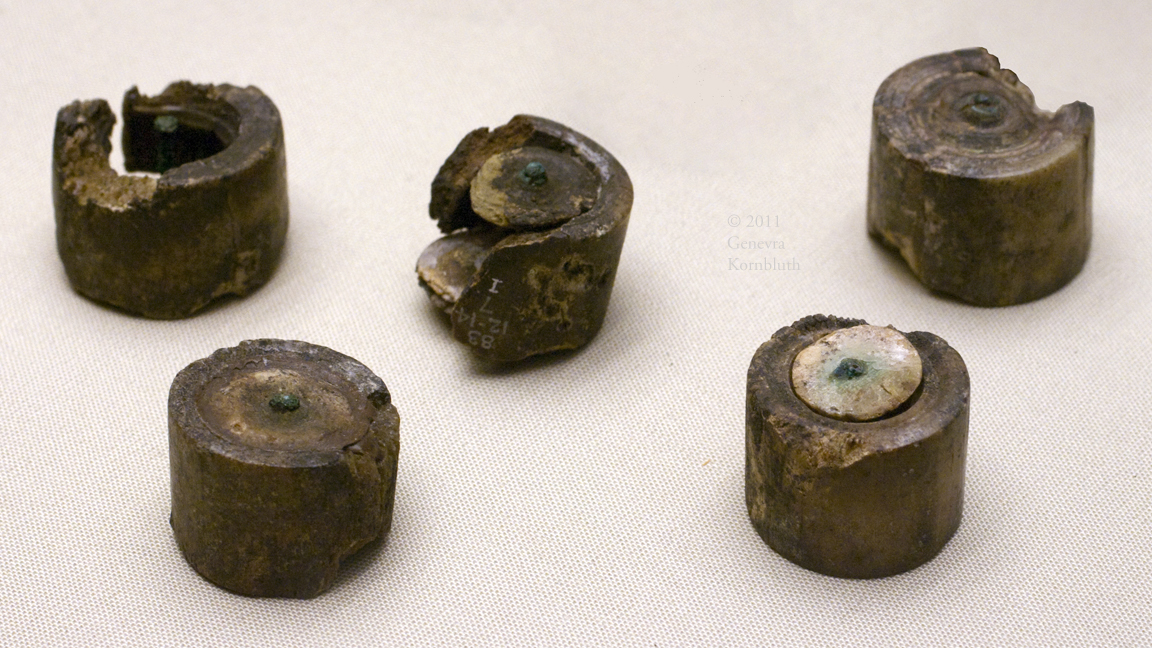 game pieces from Taplow, bone and copper alloy, 6th-7th c., BM 1883,1214.7