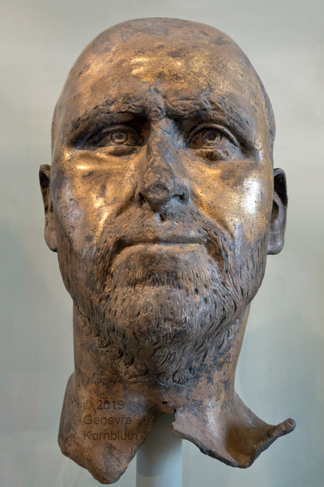 portrait head, bronze gilt, 3rd c., fr. west wall of Aquileia forum, ANAM. For profile view see ANAM.