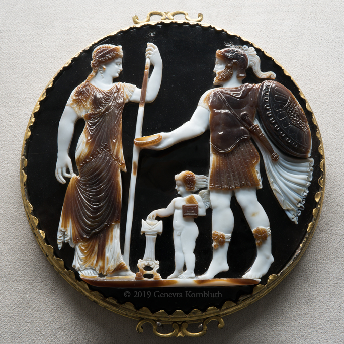 Medici cameo: emperor (Claudius Gothicus or Antoninus Pius?) with genius, sacrificing poss. to Hope, 1st-3rd c., sardonyx cameo in gilded metal, Florence MA 14443. This work has its own page.