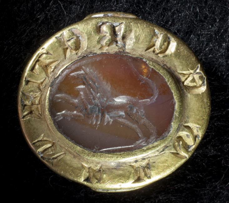 2nd-3rd c. carnelian intaglio, in 13th c. gold seal ring, HNM K.60.3.B, which has its own page