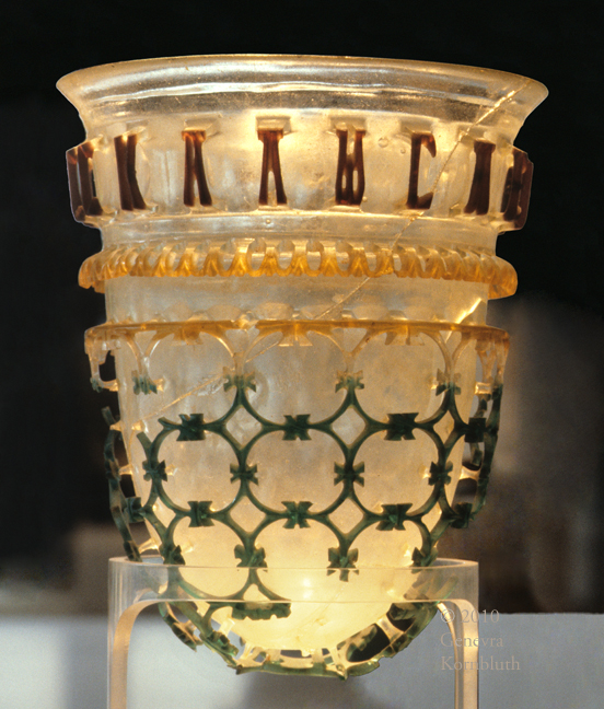 diatreta glass with Greek inscription, 3rd or 4th c., from Braunsfeld, Stollberger Str., RGM