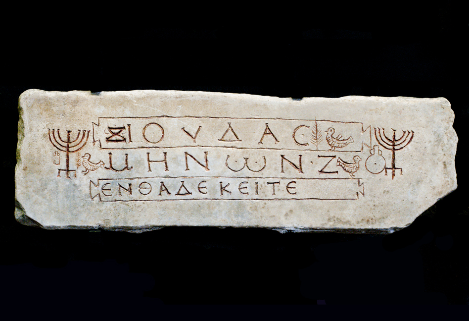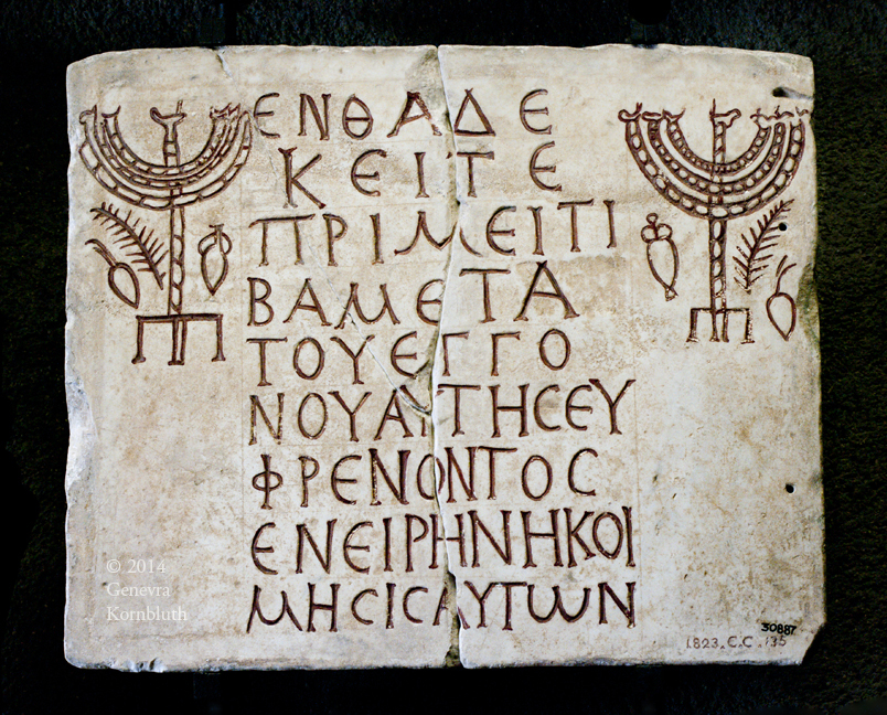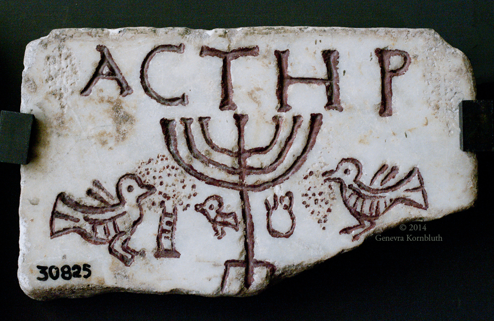 Greek marble grave stone of Judas with candelabra, palmettes, doves, flasks, from Jewish catacomb on Via Portuense, 3rd-4th or poss. *2nd-3rd c., Rome, Vat 17584
