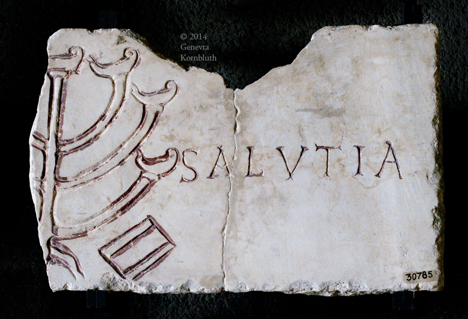Latin marble grave stone of Salutia prob. from Jewish catacomb on Via Portuense with menorah and open scroll, 3rd-4th c., Vat 30785