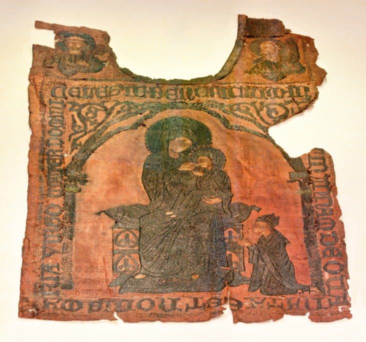St. Anne nursing Mary, w. Gregory below, Peter/Paul above: Scapular of Gregory X, silk samite with metallic embroidery, Rome? 1270s, Arezzo MS