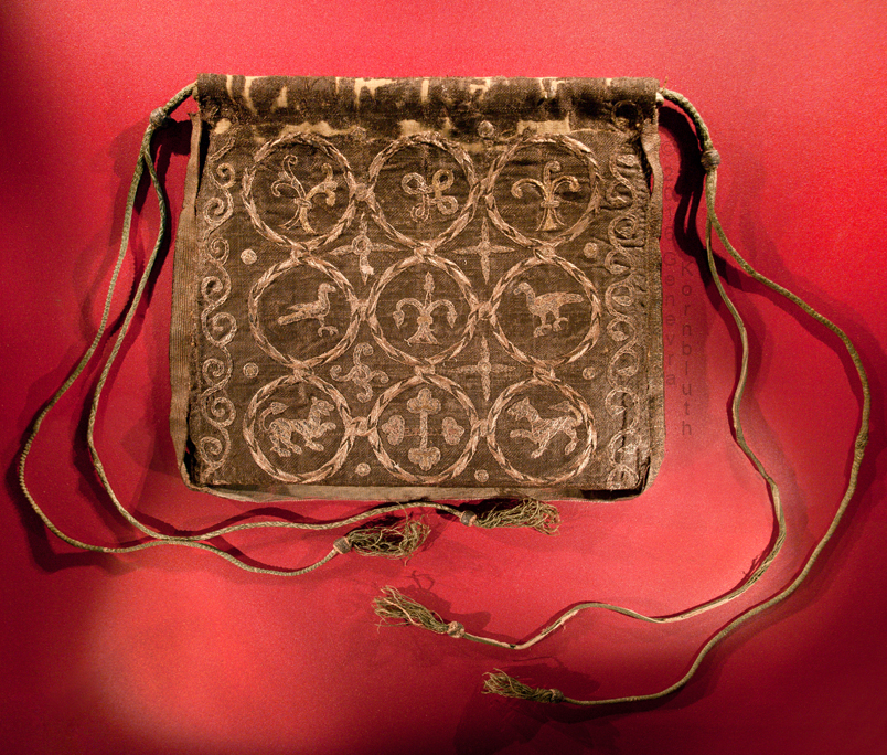 purse, silk embroidered on linen, France 13th c., Sens CT