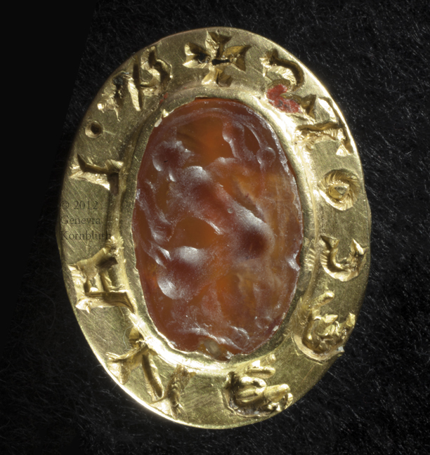 13th c. gold seal ring with 2nd-3rd c. carnelian intaglio, HNM K.60.3.B, which has its own page