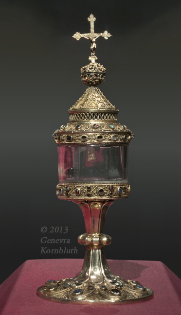Monstrance from Aywières, silver gilt, crystal and other gems, early 13th c. Mosan, cross 14th c., MRAH 2875. For details see MRAH.