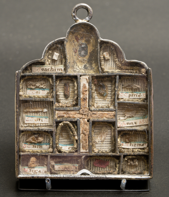 Tablet reliquary, late 13th-c. Mount Athos or Venice; cedar wood, copper alloy, horn, silver, manuscript, glass, beads, gems; MRAH 3225. This work has its own page.