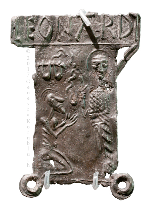 St. Leonard blessing a prisoner, manacles on wall, 13th-14th c., from Saint-Leonard-de-Noblat, France, lead alloy, MoL 82.8/13