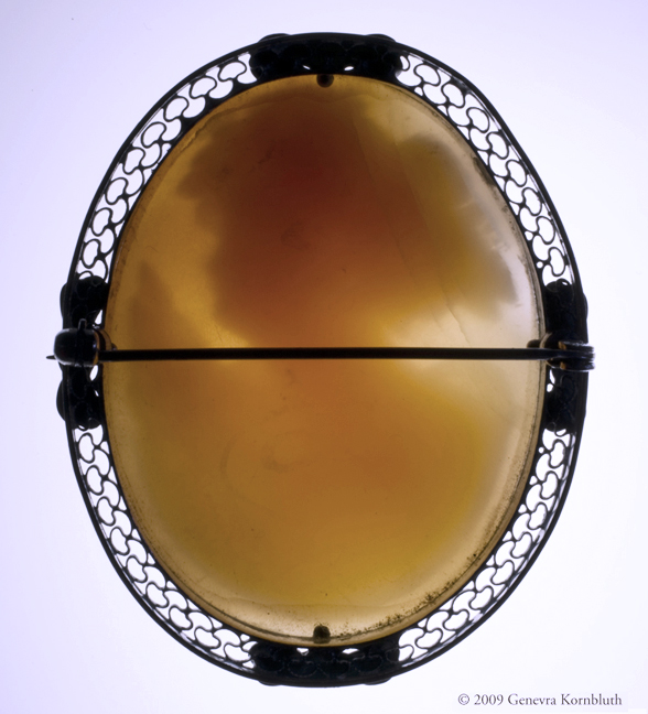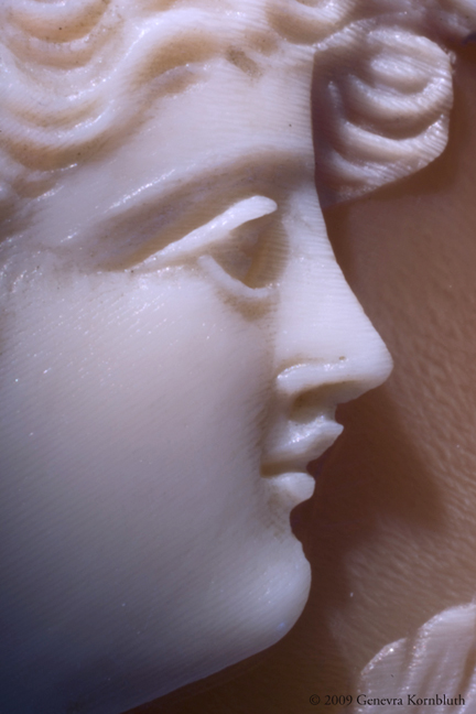 Brooch: woman in a flower wreath, shell cameo, late 19th to early 20th c., p.c.