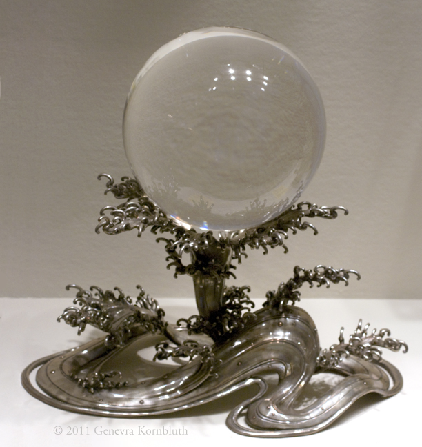 Chinese rock crystal ball, Qing Dynasty 1644-1911, on Japanese silver stand 1900-50, PMA 1944-20-2a,b