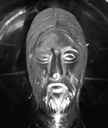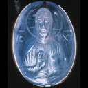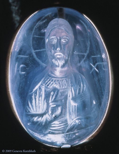 Sapphire cameo of Christ. Byzantine, twelfth century, Constantinople? Details below document the varying height of relief and its effect on light transmission, the straight cuts of a flat engraving wheel, and the facial features and gesture of blessing. Washington, D.C., Dumbarton Oaks Byzantine Collection.
